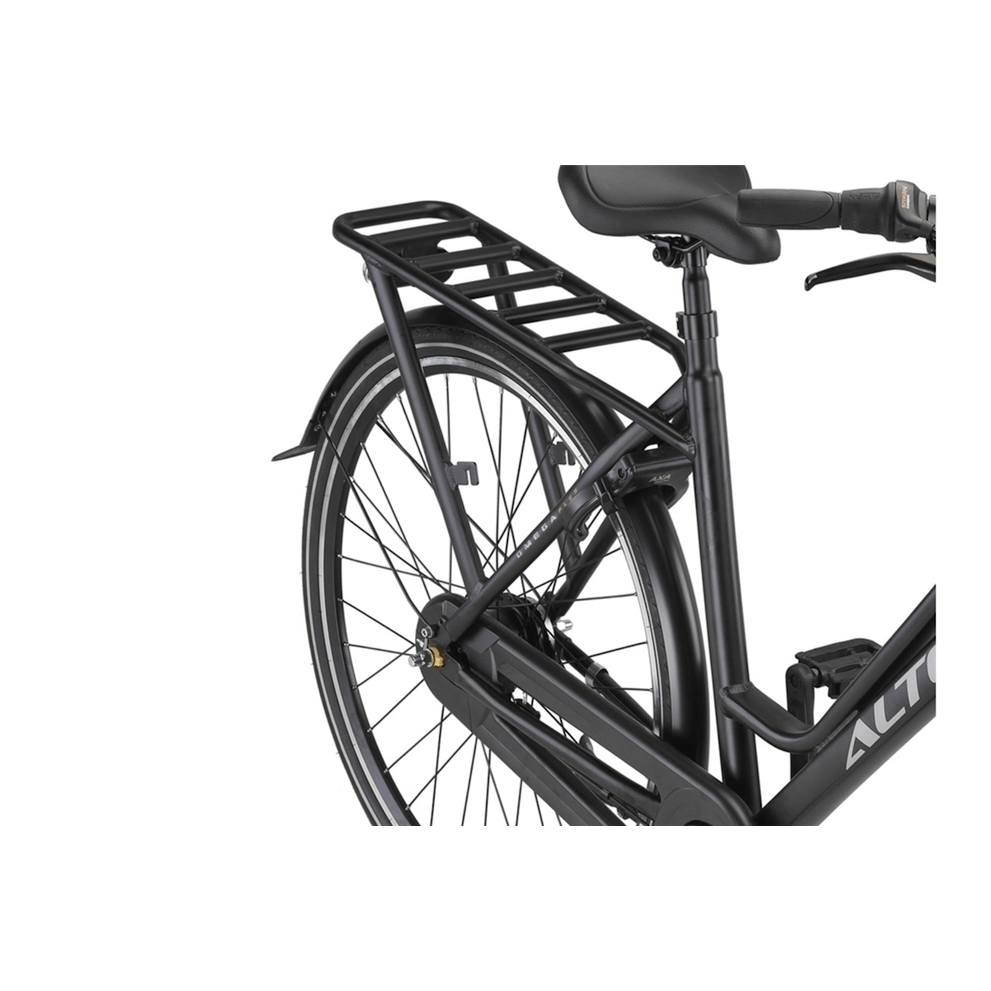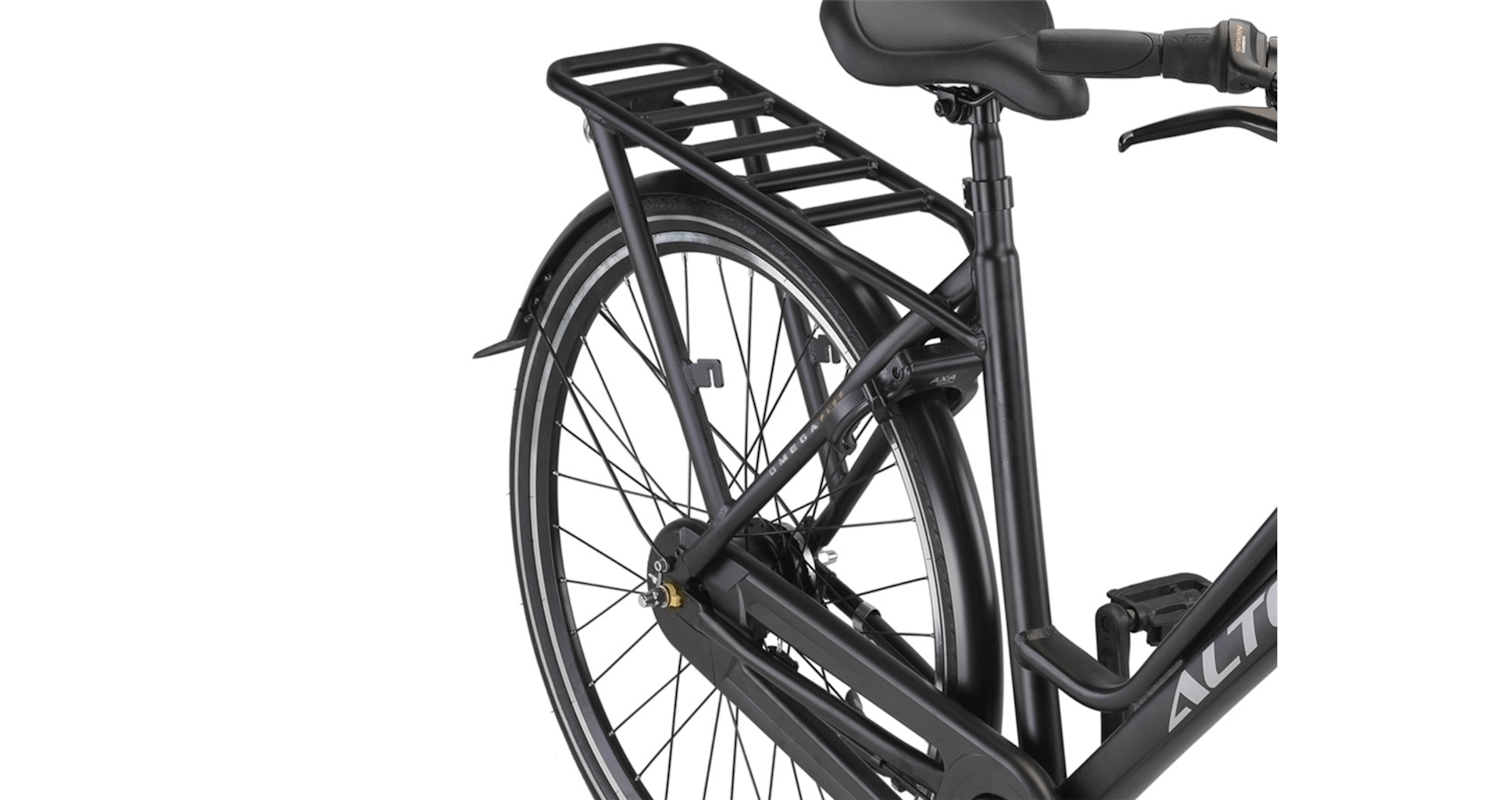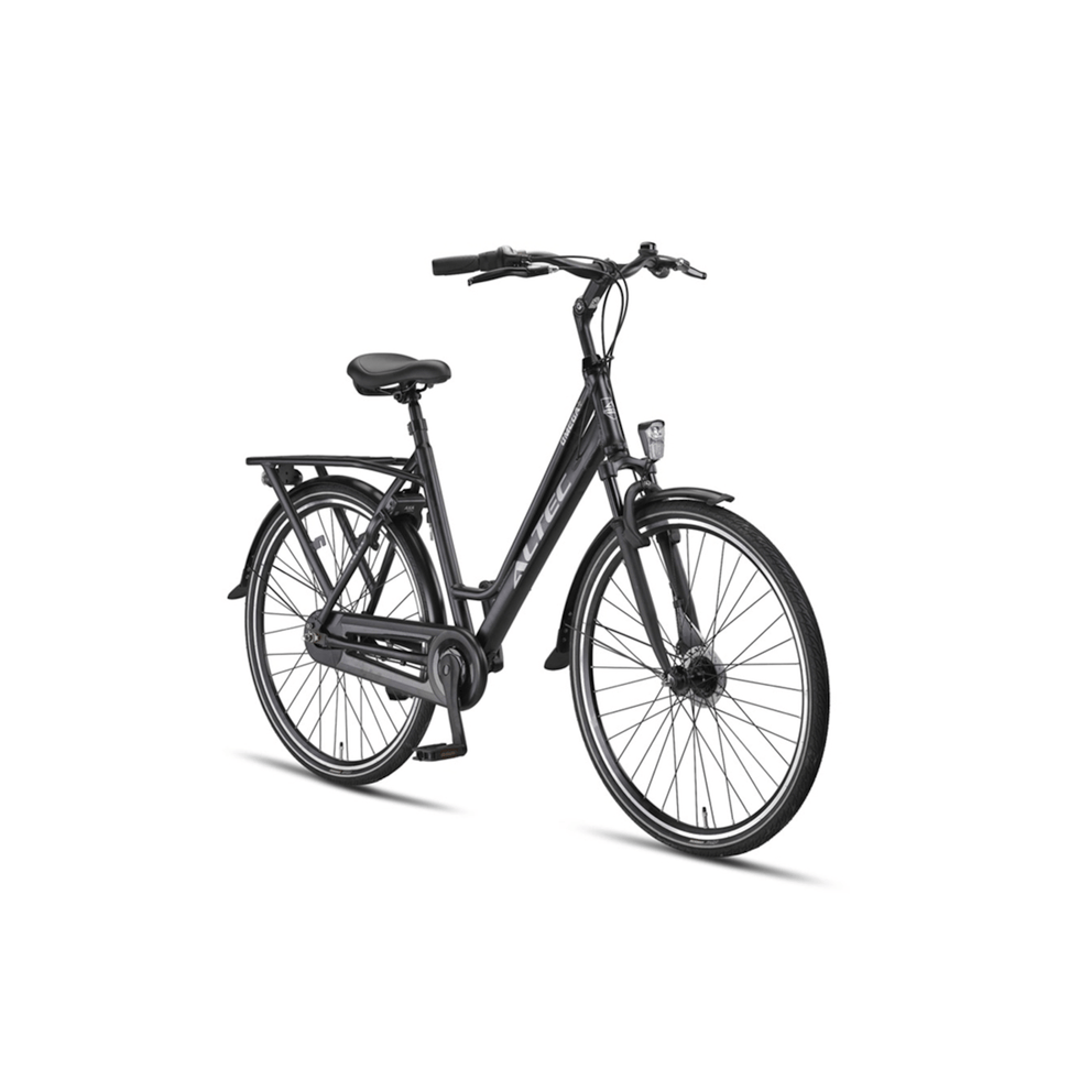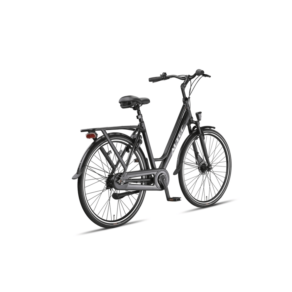De Altec Omega Plus is gebouwd met een oversized aluminium frame, wat niet alleen bijdraagt aan de moderne uitstraling, maar ook zorgt voor een lichtgewicht en roestbestendige constructie. De dubbelwandige aluminium velgen versterken de duurzaamheid, waardoor de fiets bestand is tegen intensief dagelijks gebruik.