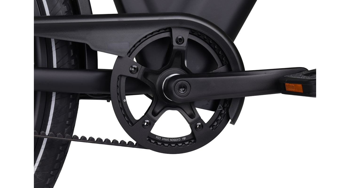 Een groot pluspunt van deze Altec Vulcan e-bike is de riemaandrijving. In tegenstelling tot een ketting is een riem stil, schoon en vraagt hij nauwelijks onderhoud. Geen gesmeer of snel slijtende onderdelen, ideaal als je zorgeloos wilt fietsen.