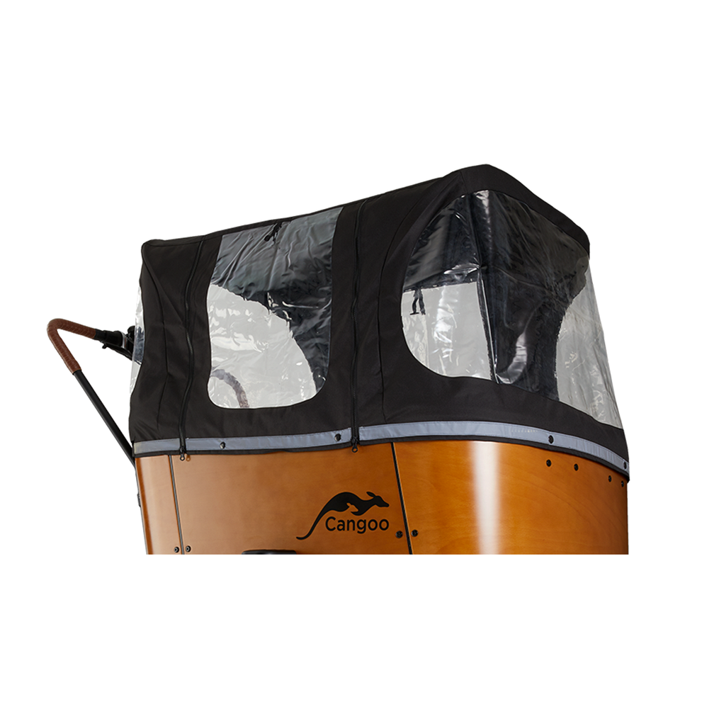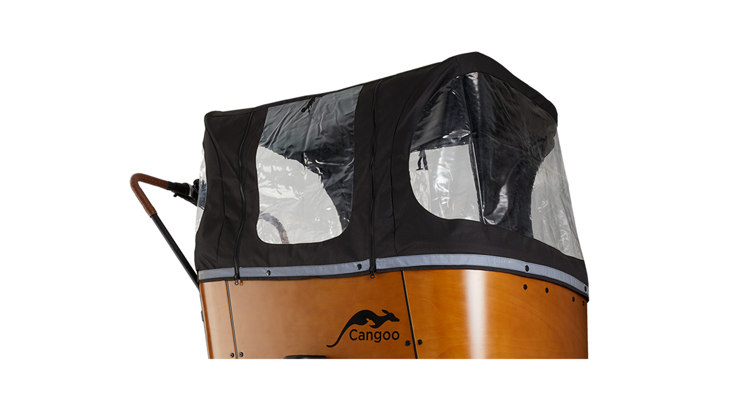Met deze originele regenhuif voor de Cangoo Buckle Up zijn jouw kinderen altijd beschermd tegen regen, wind en kou. De huif is gemaakt van stevig, waterdicht PVC met transparante vensters voor goed zicht rondom. Speciaal ontworpen voor de Buckle Up bakfiets, past hij perfect over de bak en is hij eenvoudig te bevestigen zonder gereedschap.