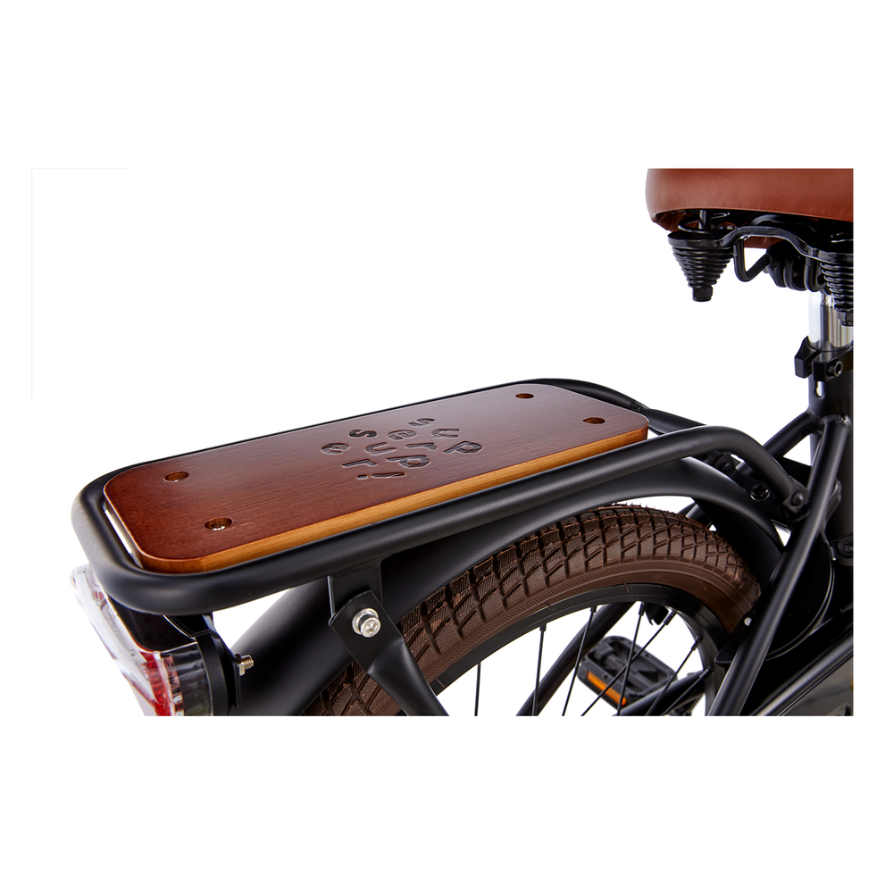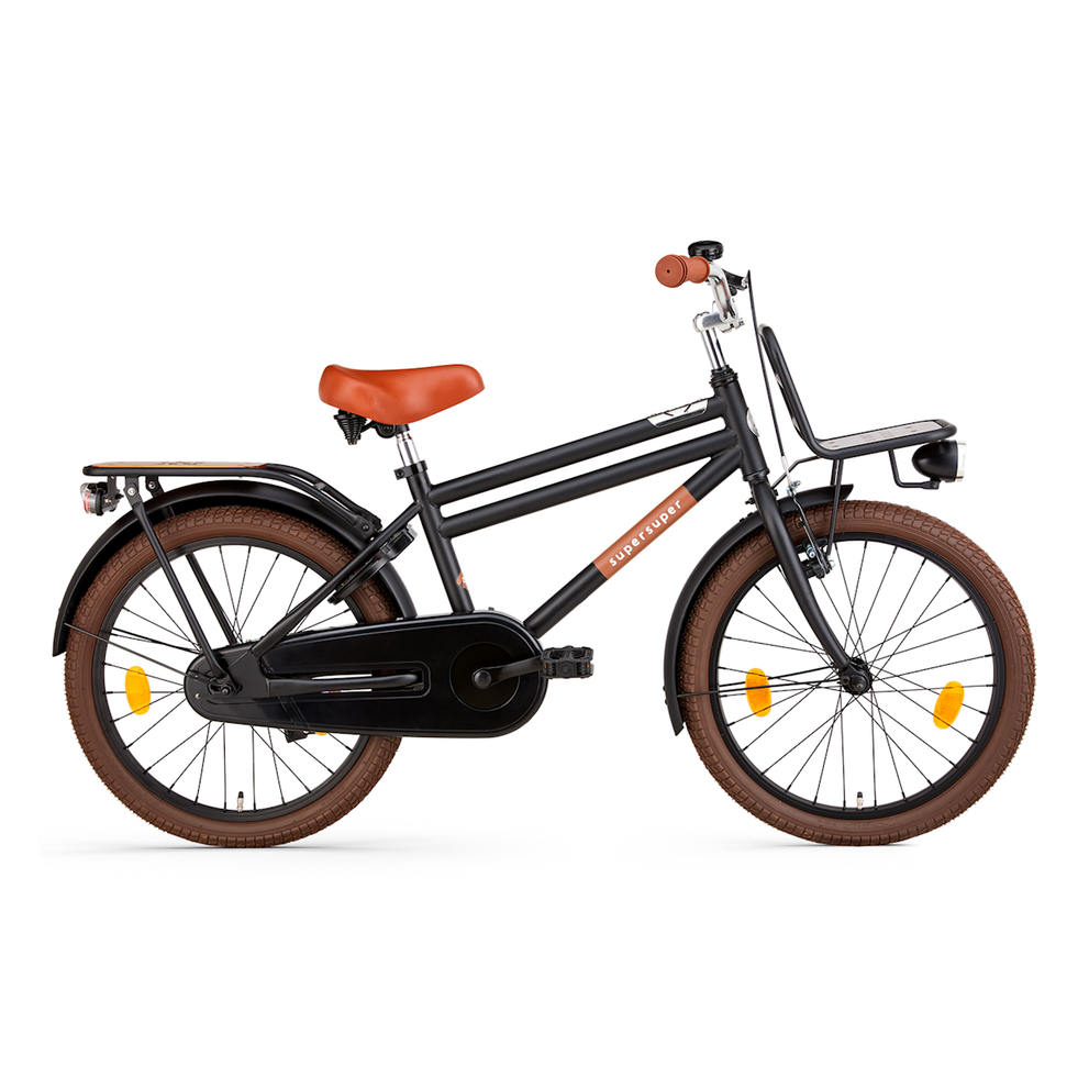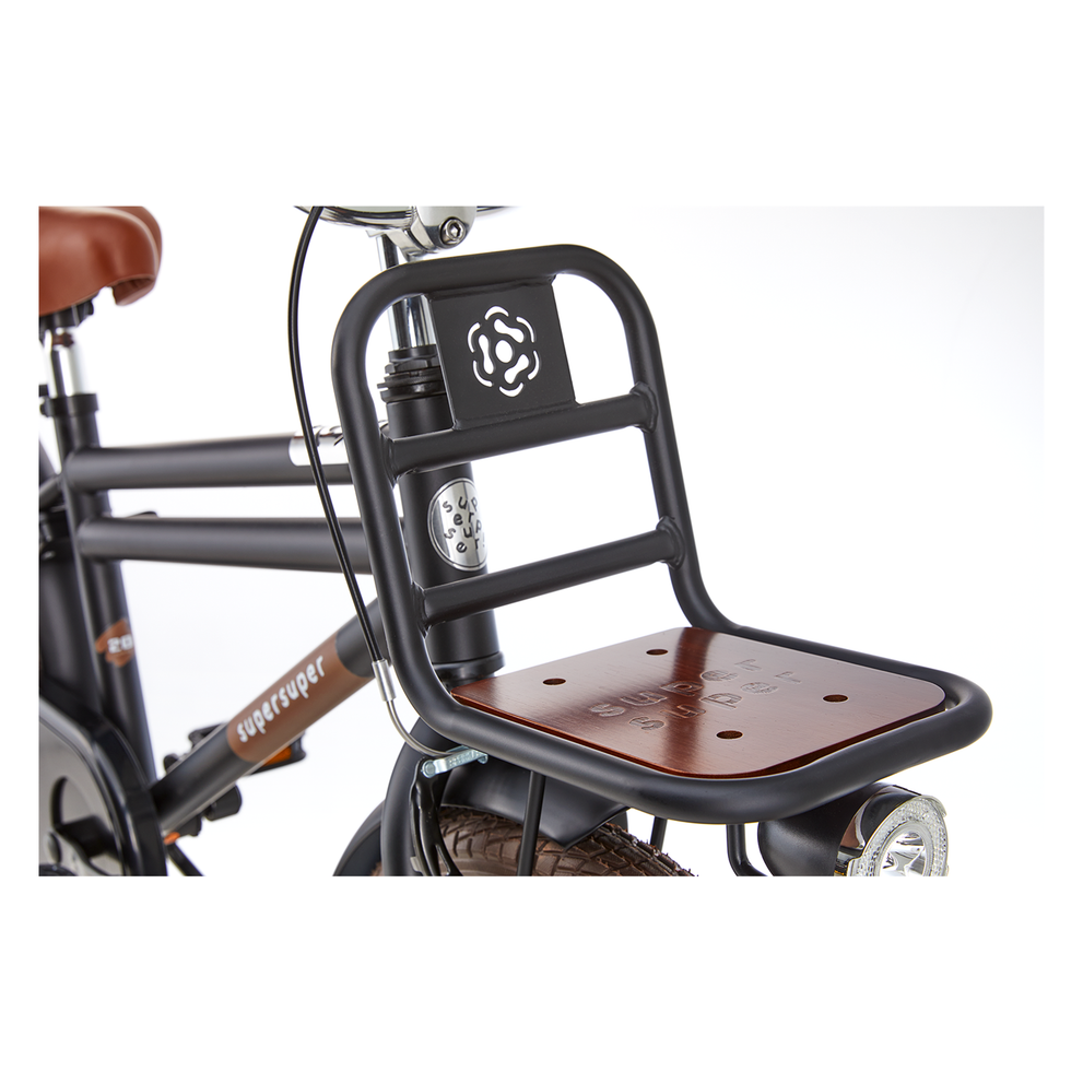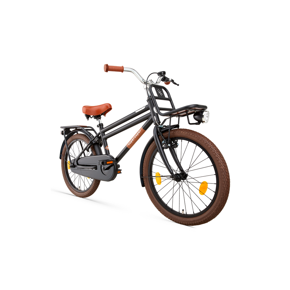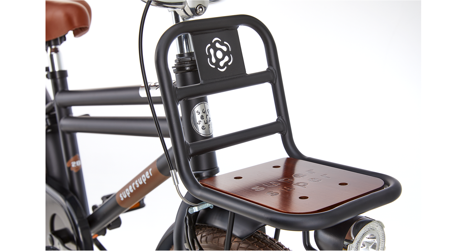 De Supersuper Cooper Bamboo 20 inch transportfiets combineert een sportieve look met handige functies. Met de ruime voor- en achterdrager neem je eenvoudig spullen mee, terwijl de LED-verlichting zorgt dat je kind altijd goed zichtbaar is, ook bij schemer of donker weer.