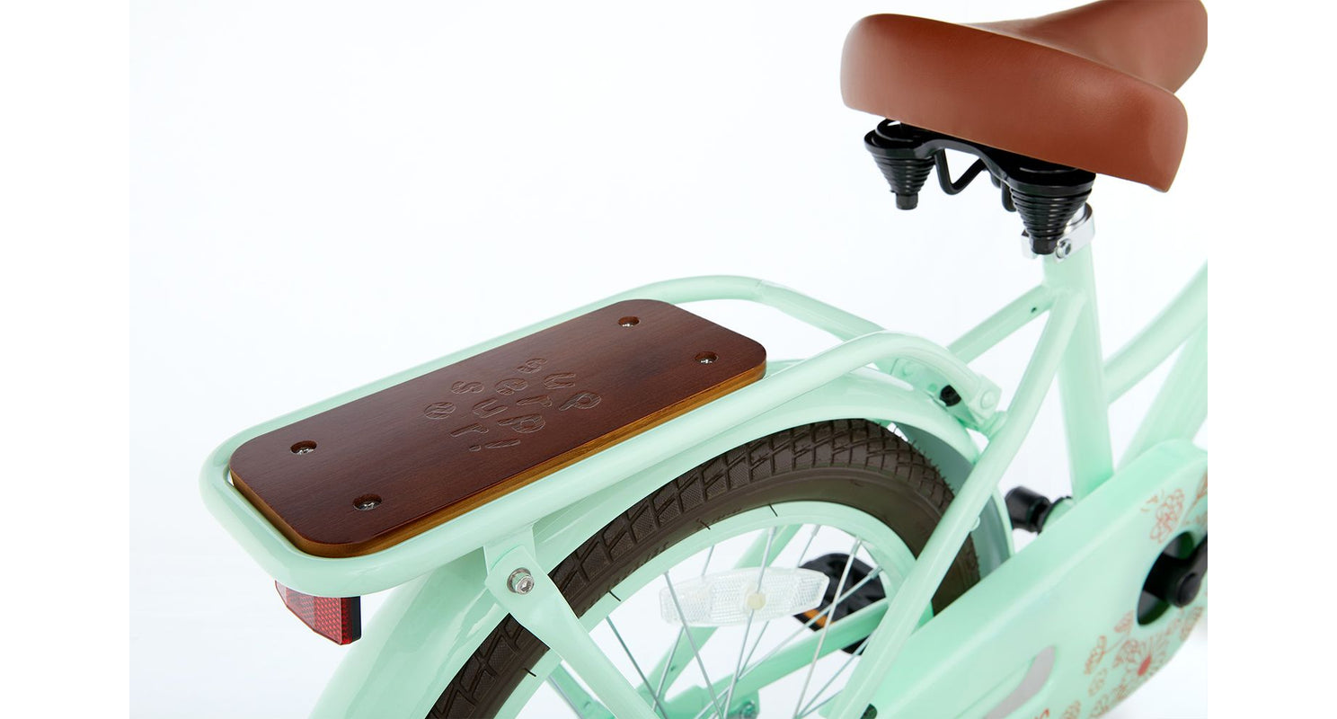 Deze fiets is uitgerust met praktische details zoals een voordrager en achterdrager met stijlvolle bamboe afwerking, afneembare zijwielen en een zijstandaard. Alles wat een beginnende fietser nodig heeft.