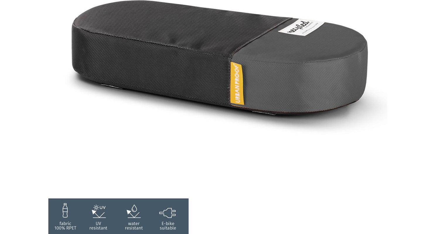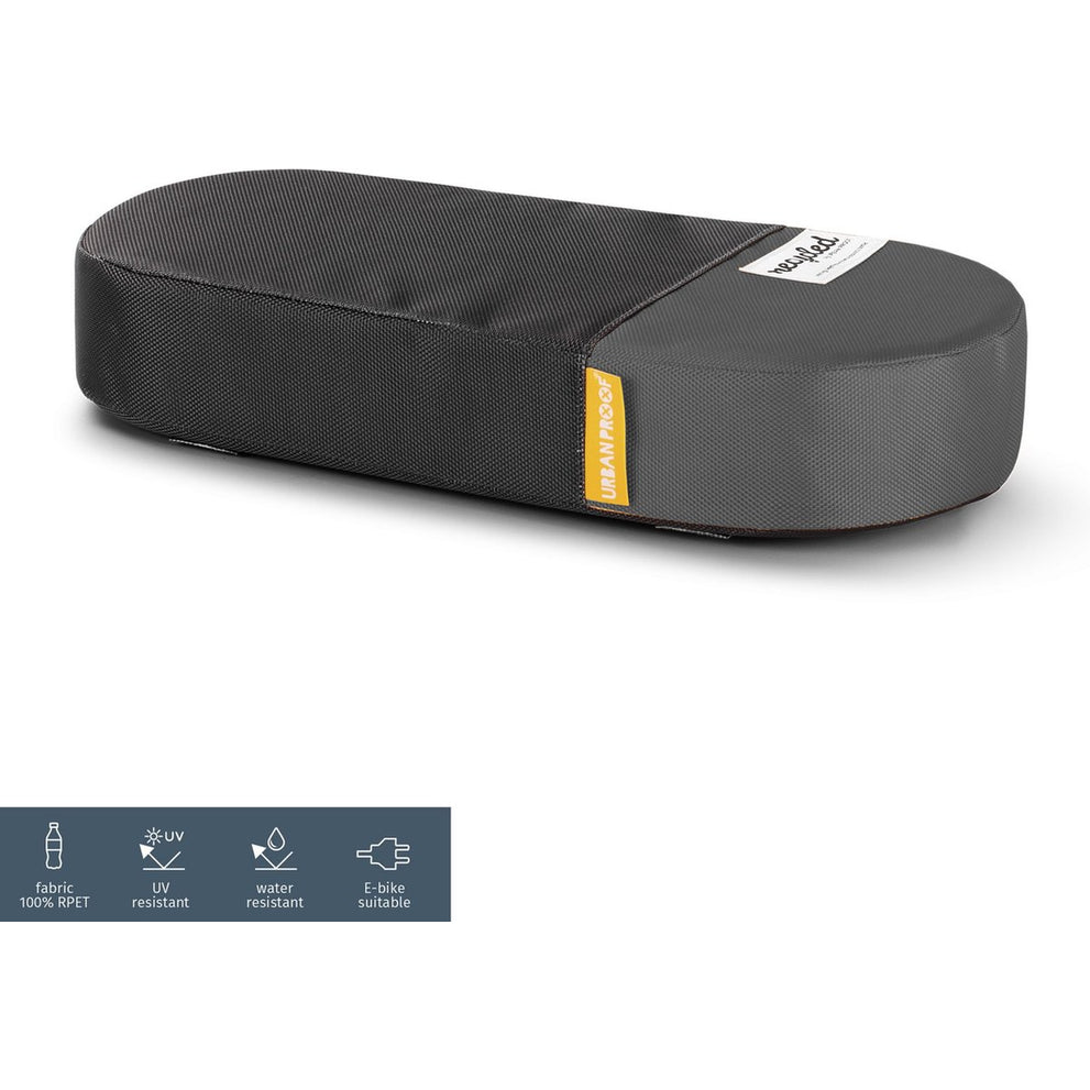 Urban Proof bagagedragerkussen is een duurzaam fietsaccessoire gemaakt van gerecycled PET materiaal (RPET). Het kussen is zo ontworpen dat het leuk is om achterop te zitten en is vanwege zijn dikte en vorm heel comfortabel. Het kussen is eenvoudig aan de bagagedrager te bevestigen met de bijgevoegde bundelbandjes. Dit bagagedragerkussen is gemaakt van waterafstotend materiaal, zodat jouw passagier nooit met natte billen achterop de fiets zit.