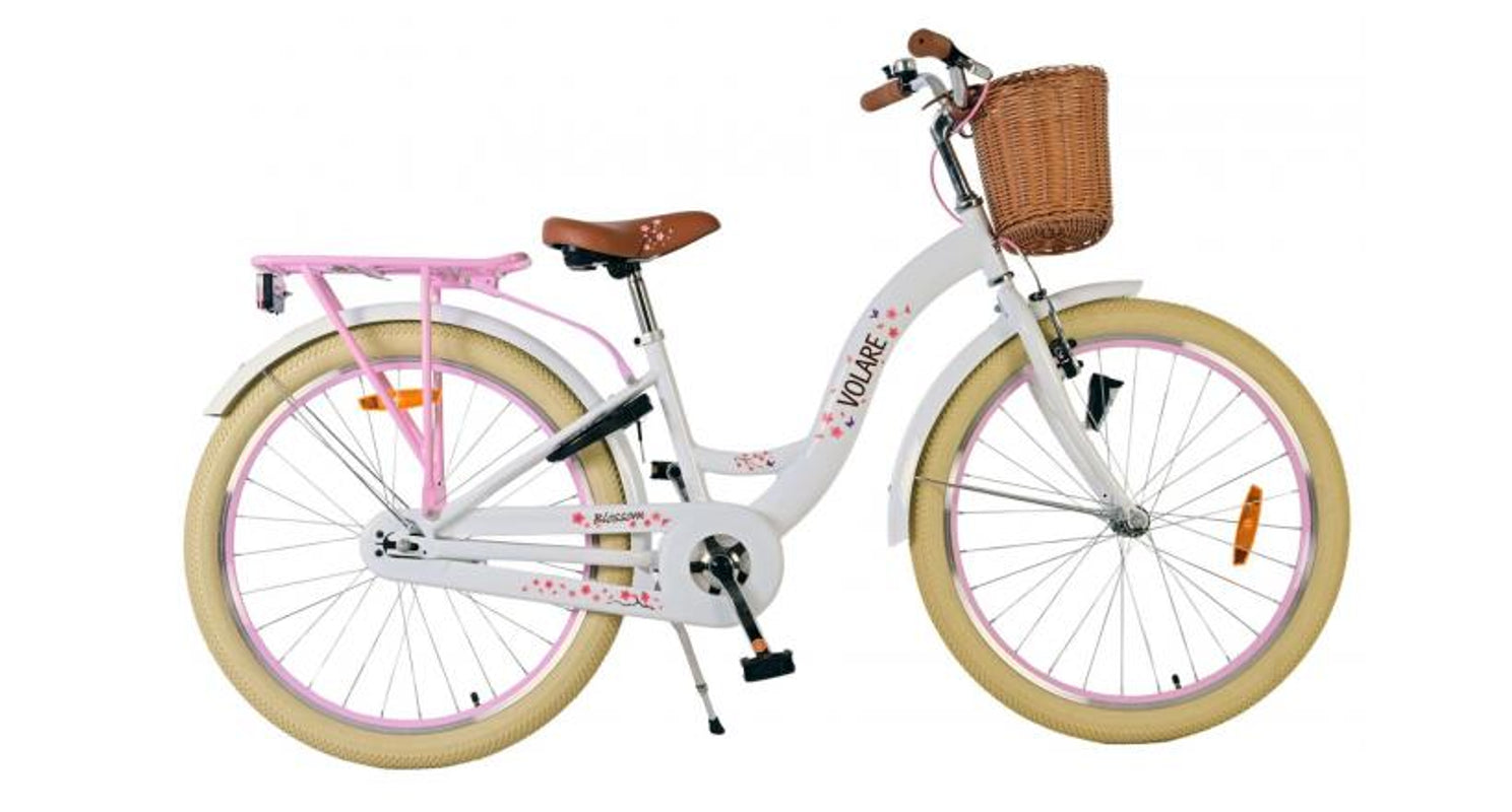 Deze 24 inch meisjesfiets in een witte kleur, versierd met Blossom bloemetjes, is de perfecte fiets voor elke jonge fietser. De fiets is uitgerust met een handige standaard, zodat je hem makkelijk kunt neerzetten zonder dat hij omvalt. Dankzij de verlichting voor en achter ben je altijd goed zichtbaar in het donker of bij schemering. Het praktische mandje voorop biedt voldoende ruimte voor allerlei spullen.