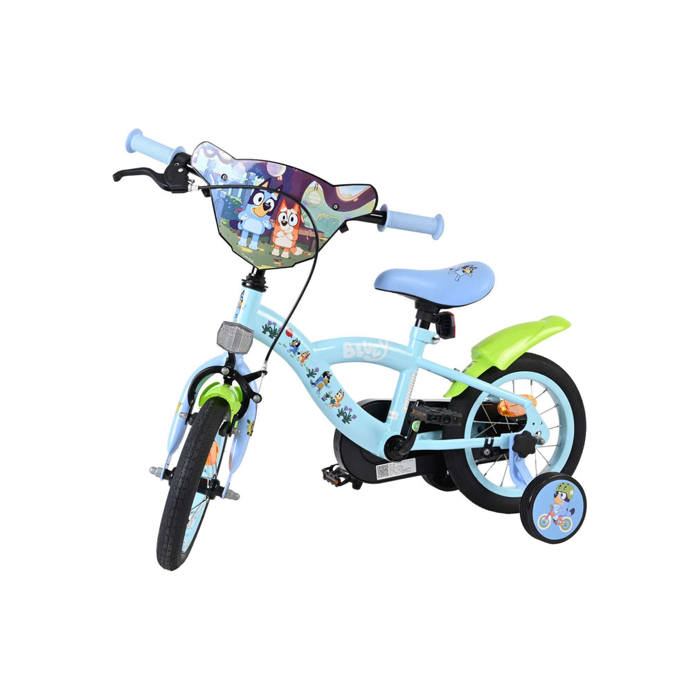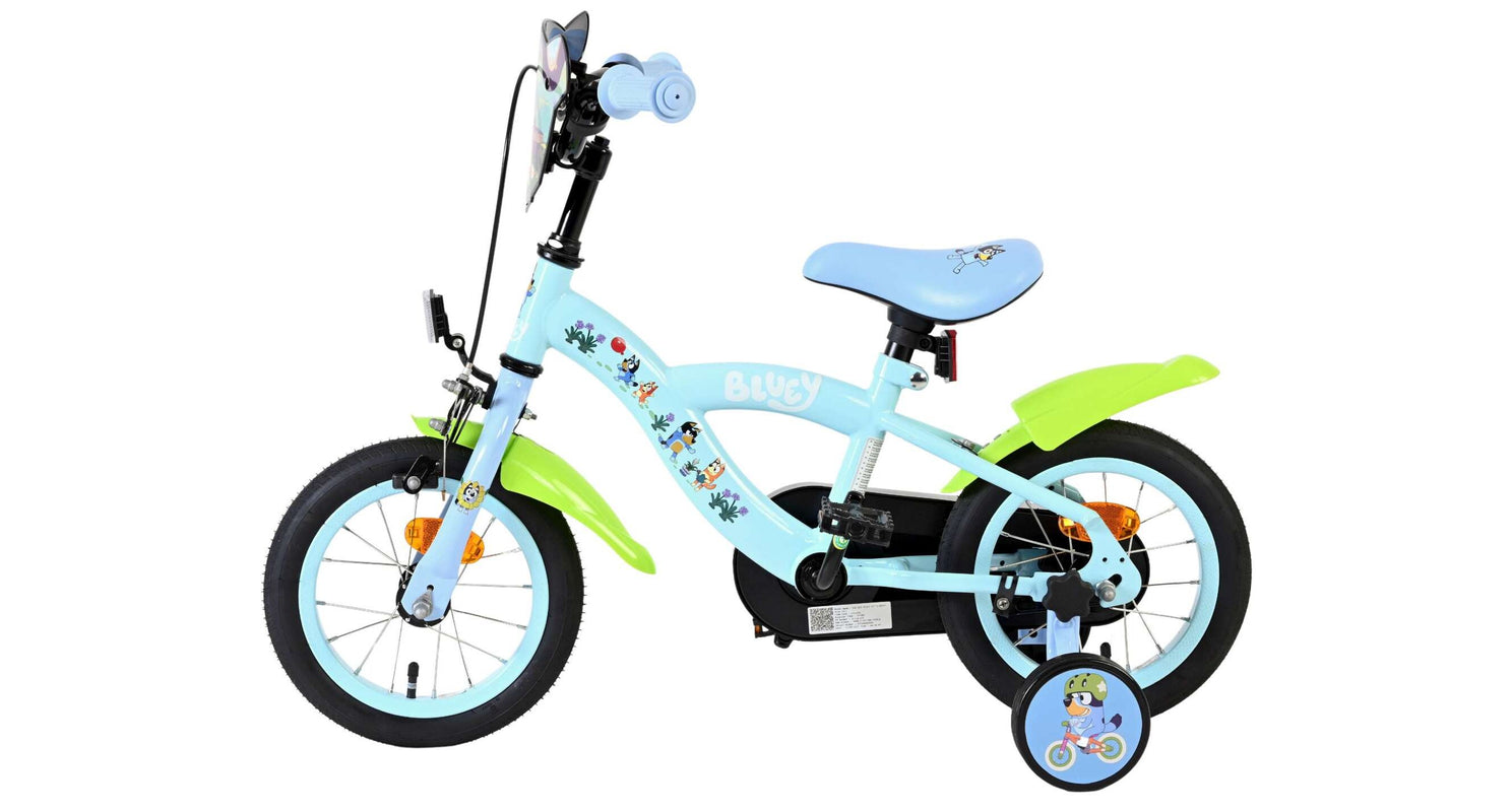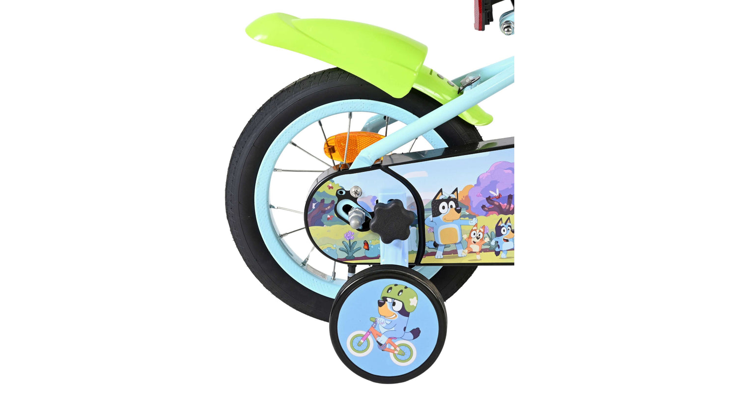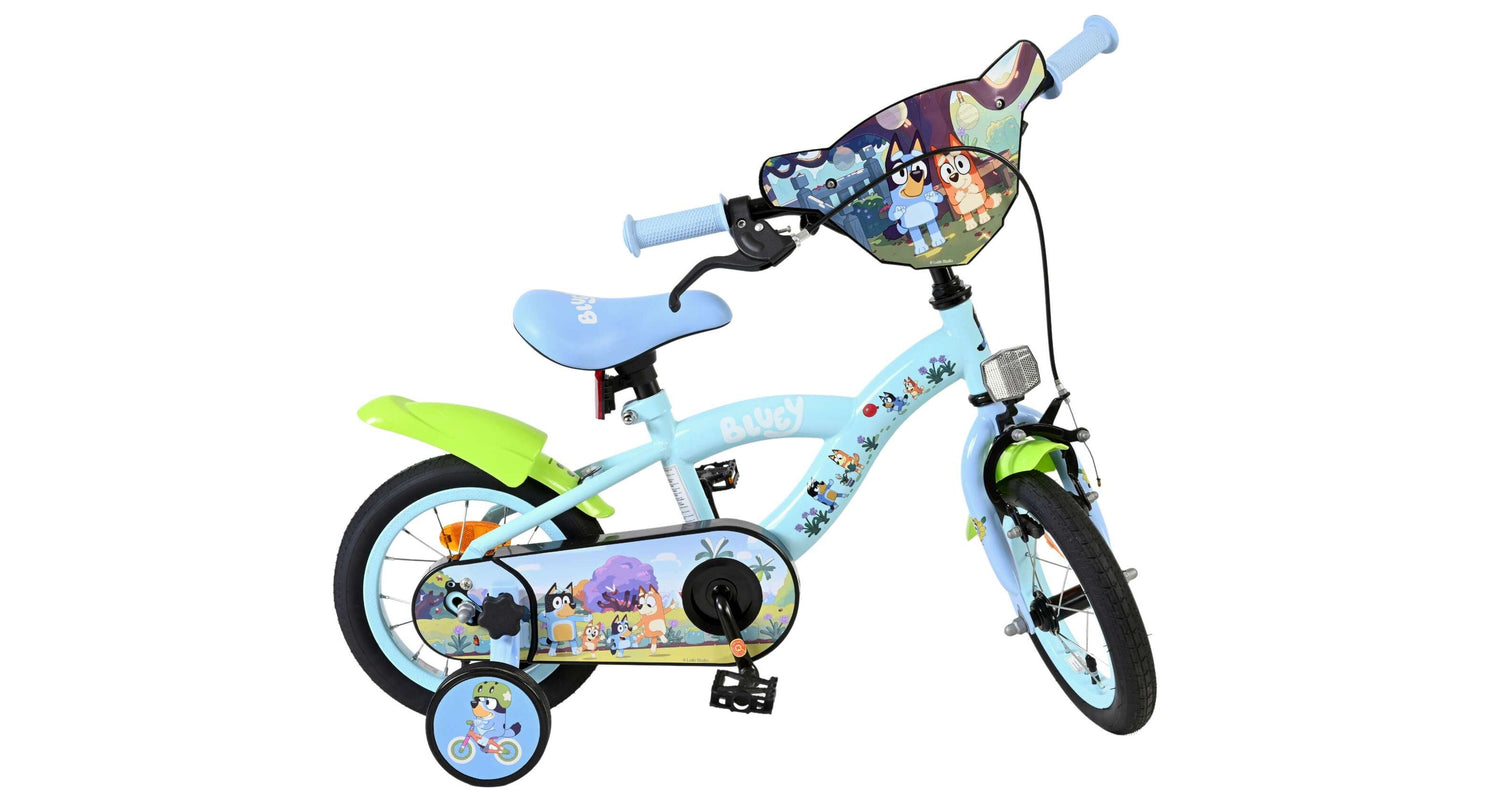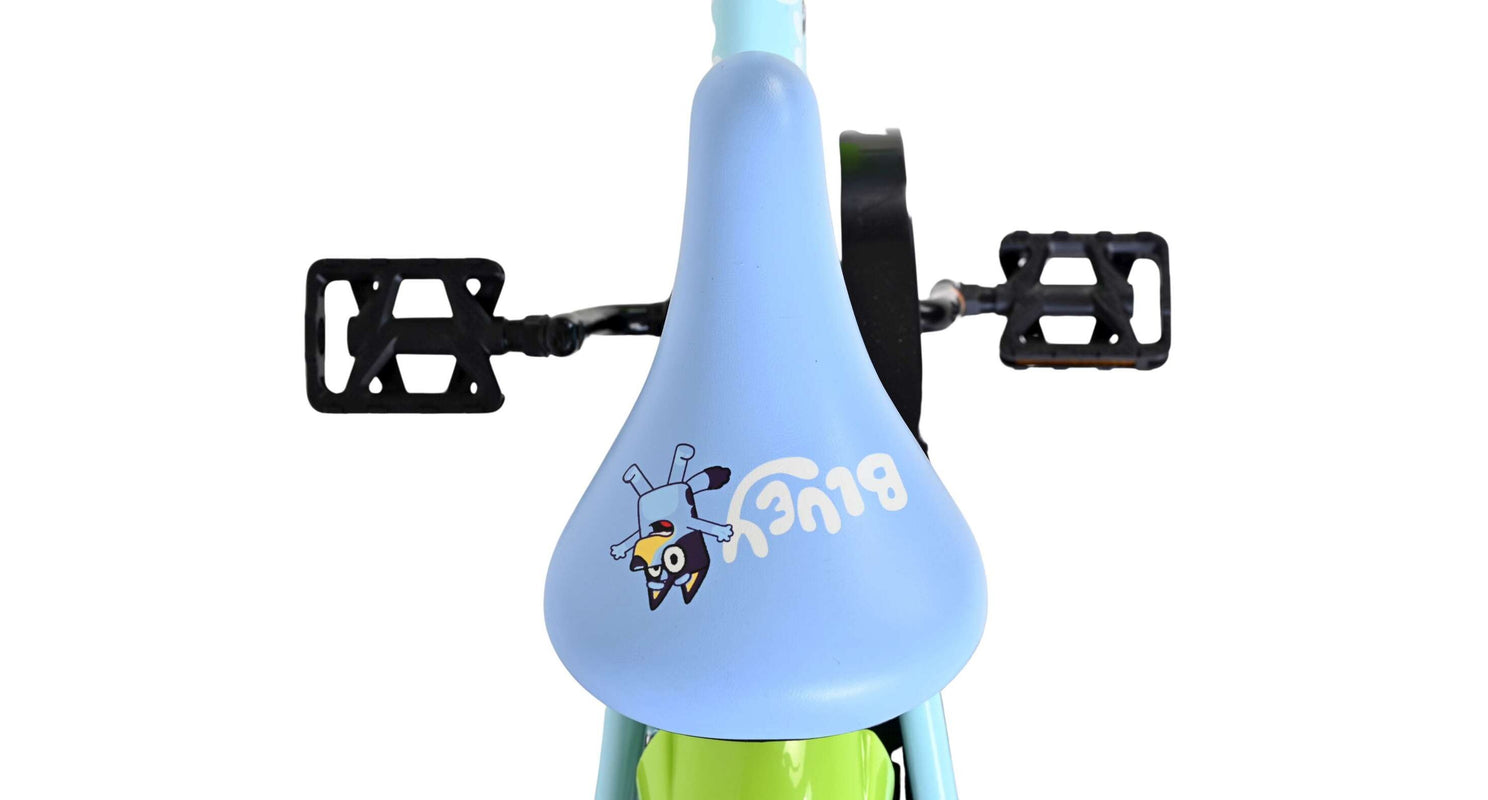 Stap op en beleef de leukste avonturen met de Volare Bluey 12 inch kinderfiets! Deze prachtige lichtblauwe fiets is speciaal ontworpen voor jonge Bluey-fans en combineert veiligheid, comfort én vrolijk design. Overal op de fiets vind je vrolijke afbeeldingen van Bluey, met als blikvanger het voorplaatje op het stuur dat meteen de aandacht trekt.