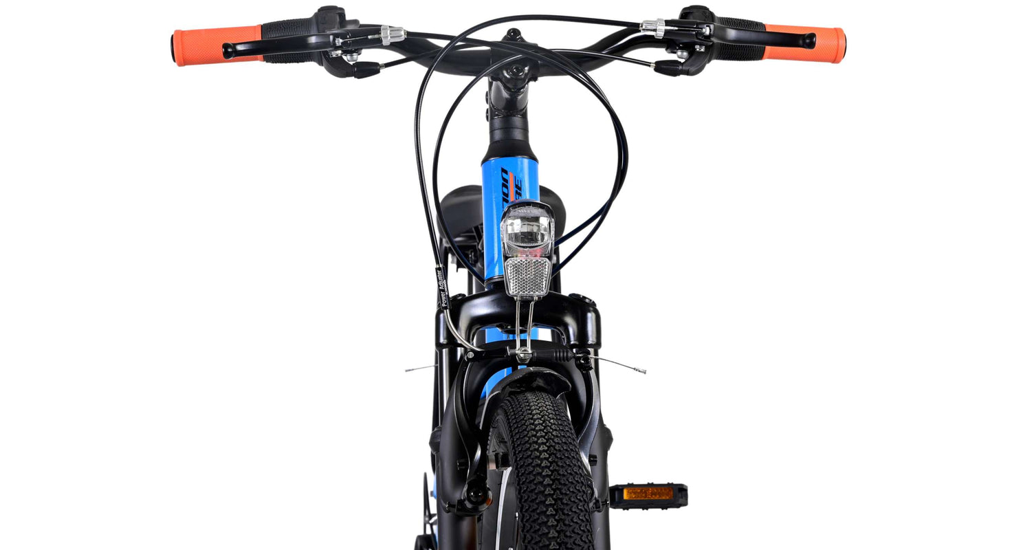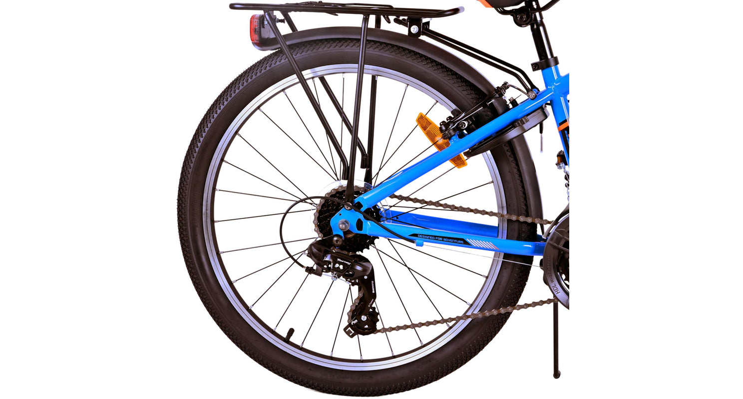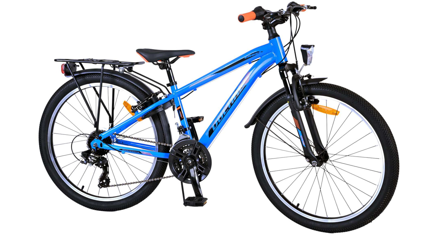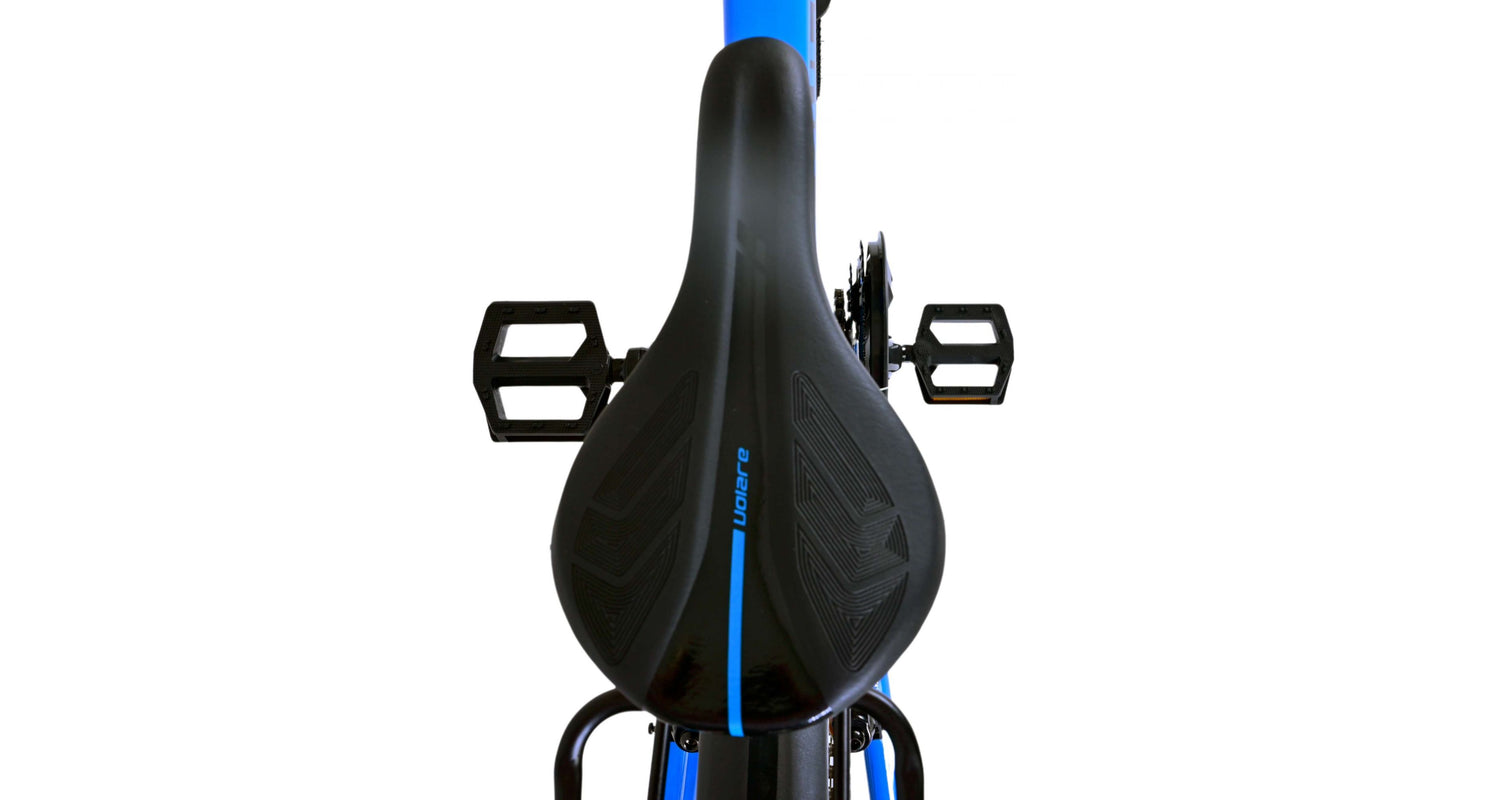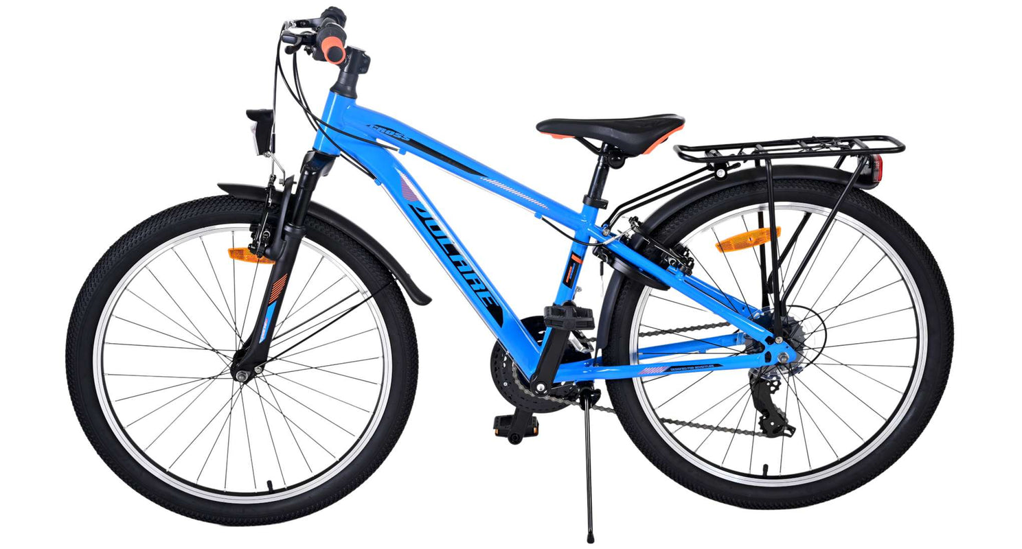 Veiligheid staat voorop! Daarom heeft deze gave fiets geen terugtraprem maar twee handremmen, 21 versnellingen, reflectoren in de wielen en verlichting op batterij voor en achter. Ook aan het comfort is gedacht. De mooie donkerblauwe Volare fiets heeft een handige achterdrager om moeiteloos al je spullen mee te nemen, een comfortabel zacht zadel, een standaard zodat je fiets altijd netjes blijft staan en een stevig slot. Om zo lang mogelijk van de fiets te kunnen genieten heeft deze een extra lange zadelpen waardoor de fiets nóg langer met het kind meegroeit. Let op, het stuur is niet in hoogte verstelbaar!