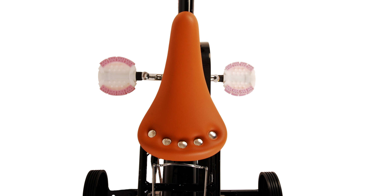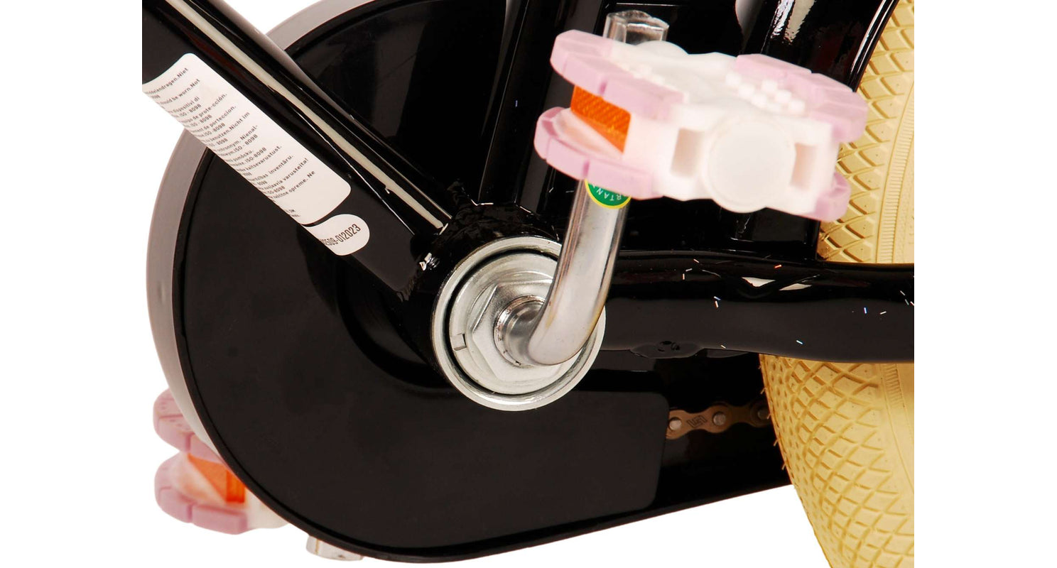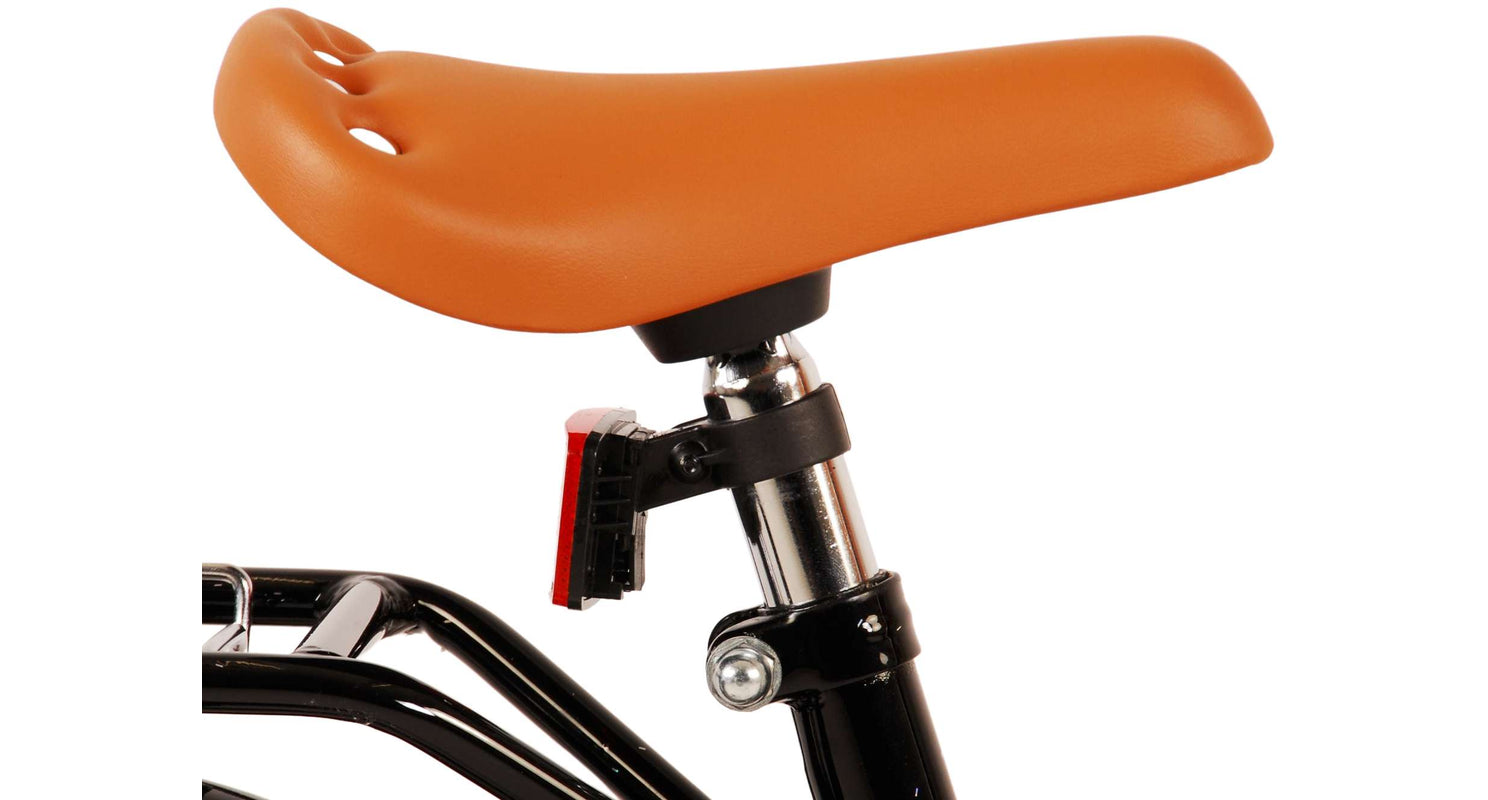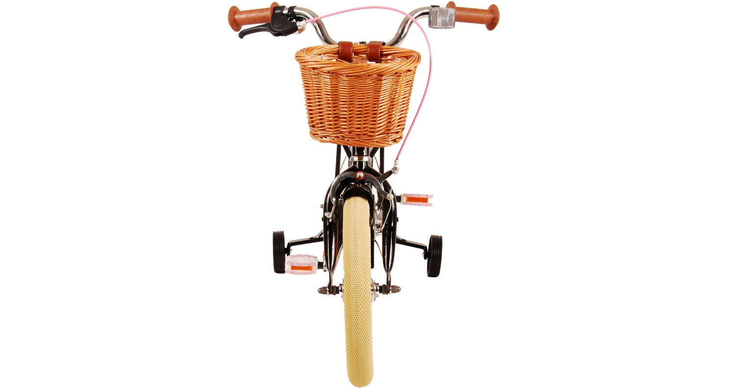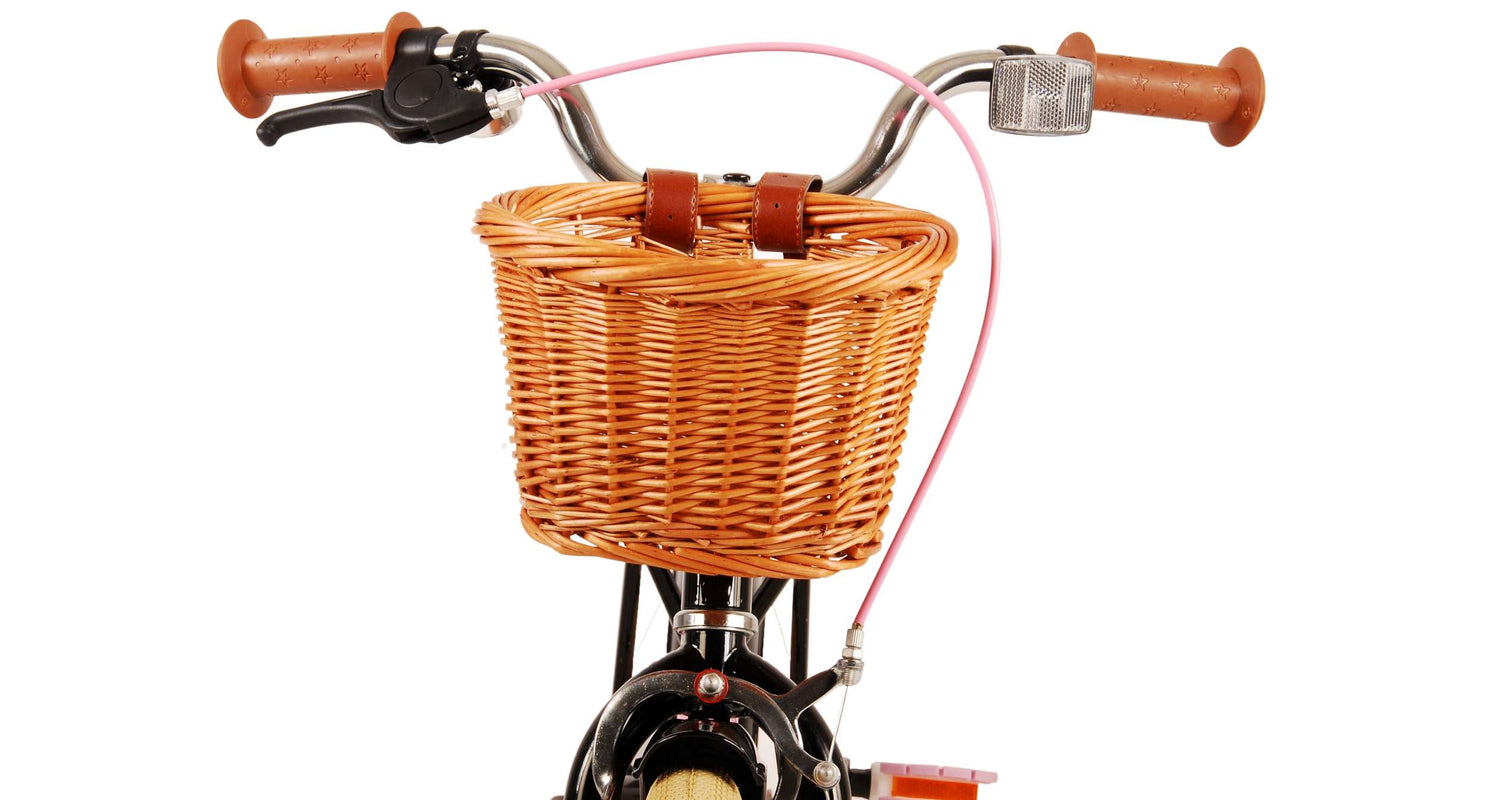 Veiligheid staat voorop! Daarom heeft deze gave fiets een handrem en terugtraprem, afneembare zijwieltjes en een gesloten kettingkast. Daarnaast heeft de fiets reflectoren achter en een leuke bel. Ook aan het comfort is gedacht. De mooie zwarte Volare fiets heeft een handige achterdrager, een luxe zacht zadel en een handig rieten mandje. Om zo lang mogelijk van de fiets te kunnen genieten zijn het zadel en stuur in hoogte verstelbaar. Wordt geleverd inclusief al het montagemateriaal dat nodig is om de fiets in elkaar te zetten!