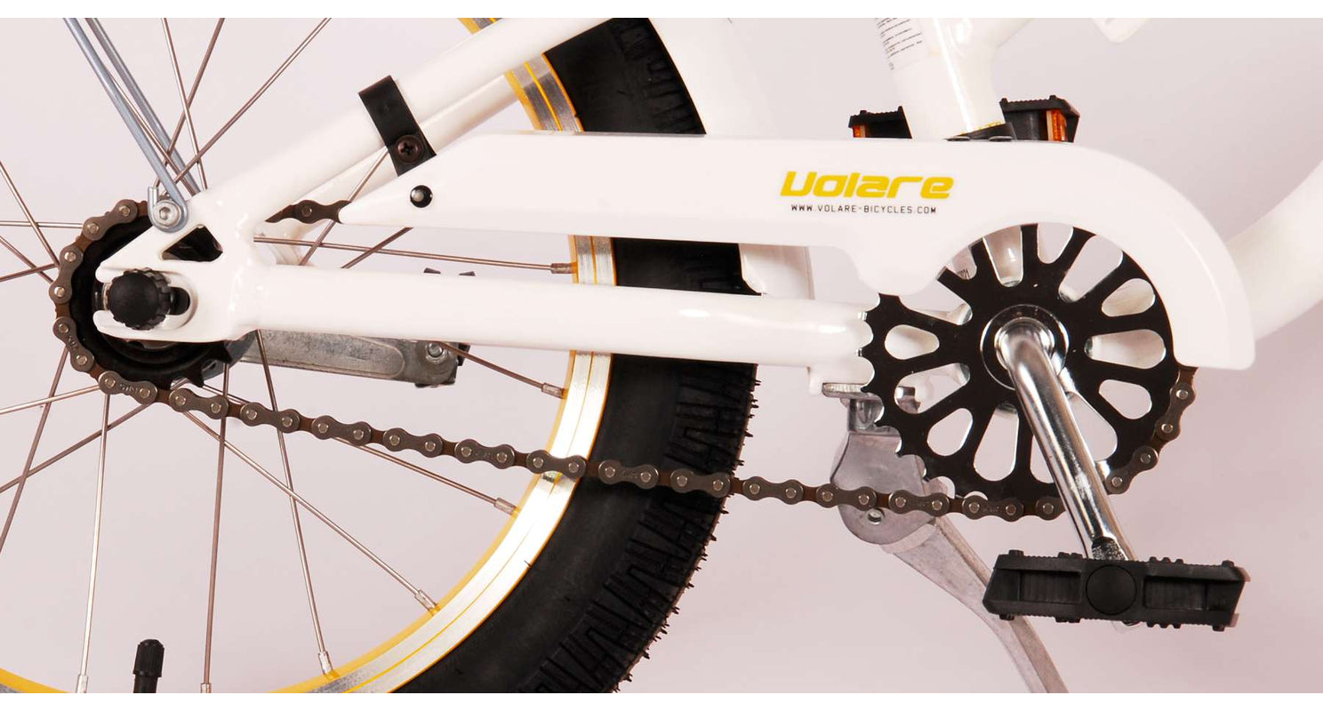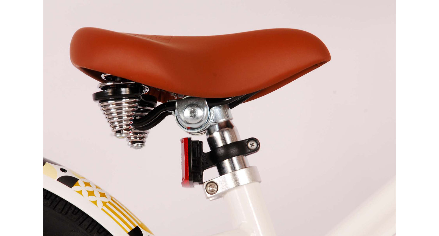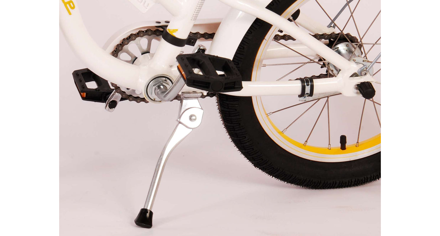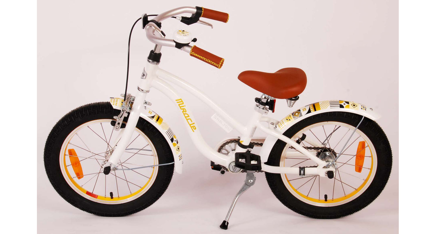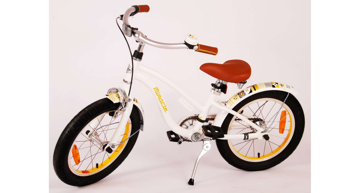 Veiligheid staat voorop! Daarom heeft deze gave fiets een terugtraprem en handrem en reflectoren in de pedalen. Ook aan het comfort is gedacht. De mooie witte Miracle fiets heeft een extra licht aluminium frame, een standaard zodat je fiets netjes blijft staan en een comfortabel zacht zadel. Om zo lang mogelijk van de fiets te kunnen genieten zijn het zadel en stuur in hoogte verstelbaar. Kortom: een topkwaliteit fiets waar uw kind nog jaren van kan genieten.