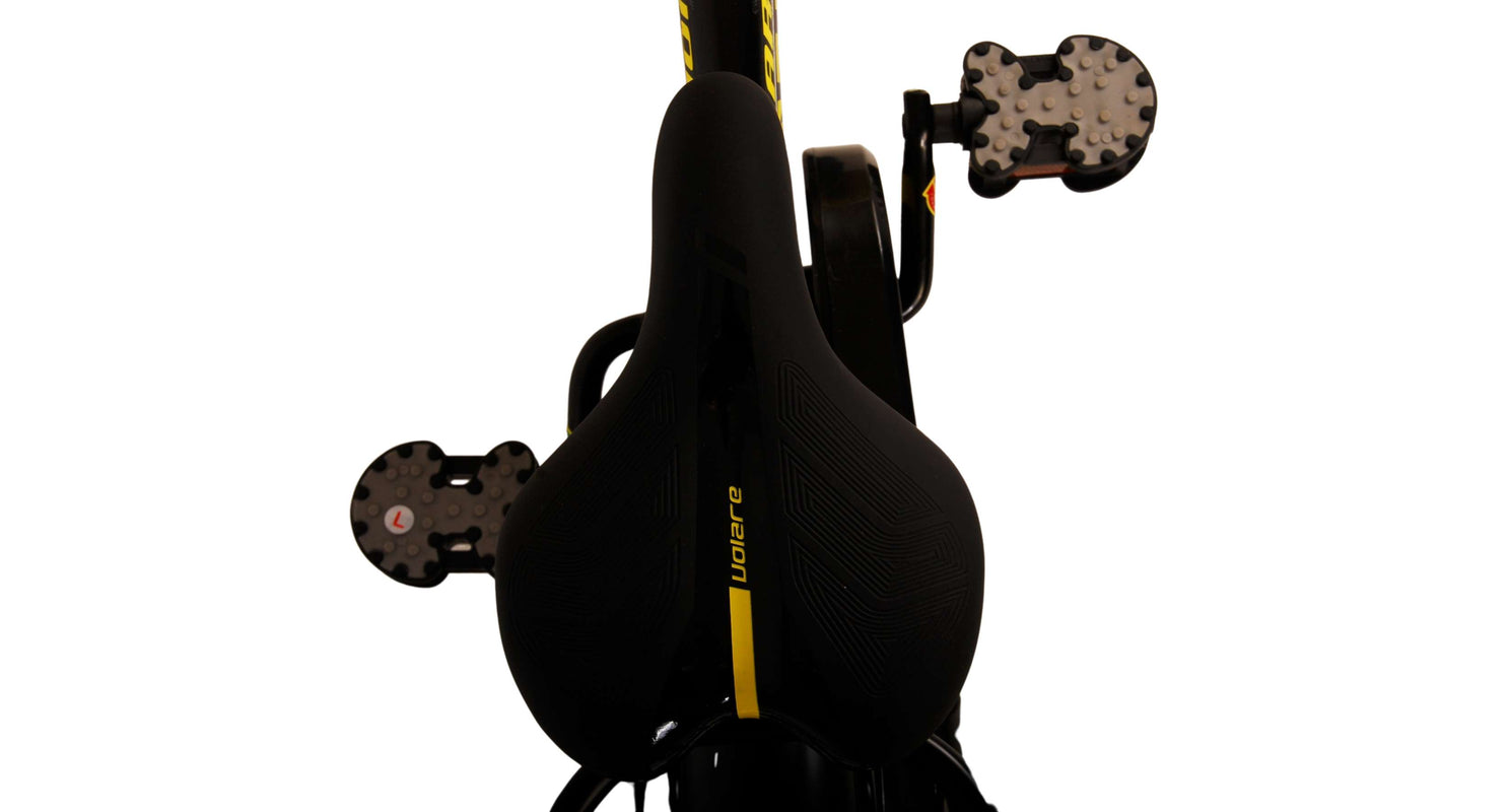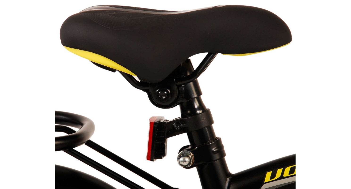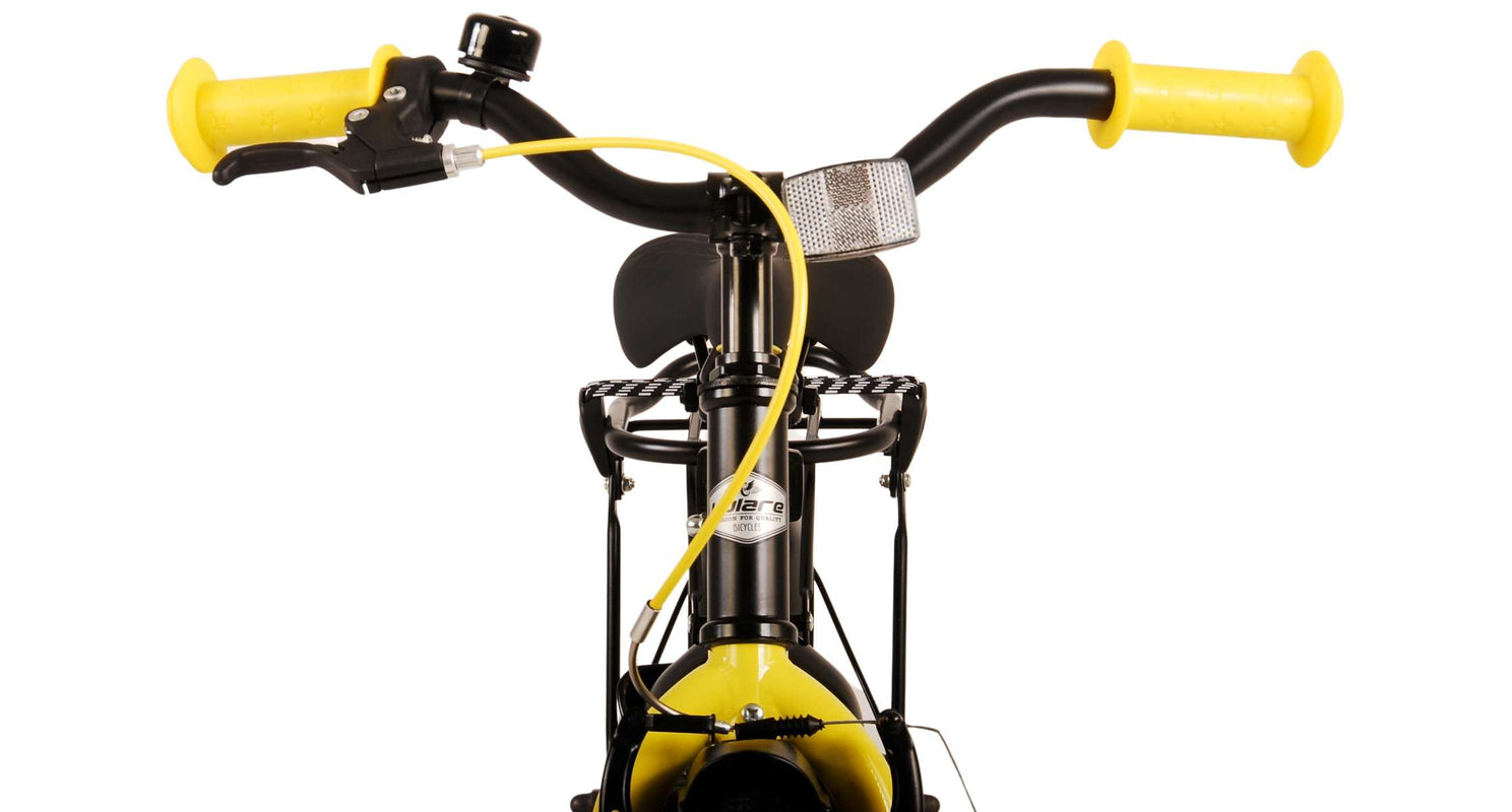 Veiligheid staat voorop! Daarom heeft deze gave fiets een handrem en terugtraprem, een gesloten kettingkast en afneembare zijwieltjes. Daarnaast heeft de fiets een leuke bel. Ook aan het comfort is gedacht. De mooie zwarte Volare fiets met gele accenten heeft een luxe zacht zadel, een handige achterdrager, en extra lange spatborden om al het vuil tegen te houden. Om zo lang mogelijk van de fiets te kunnen genieten zijn het zadel en stuur in hoogte verstelbaar. Wordt geleverd inclusief al het montagemateriaal dat nodig is om de fiets in elkaar te zetten!