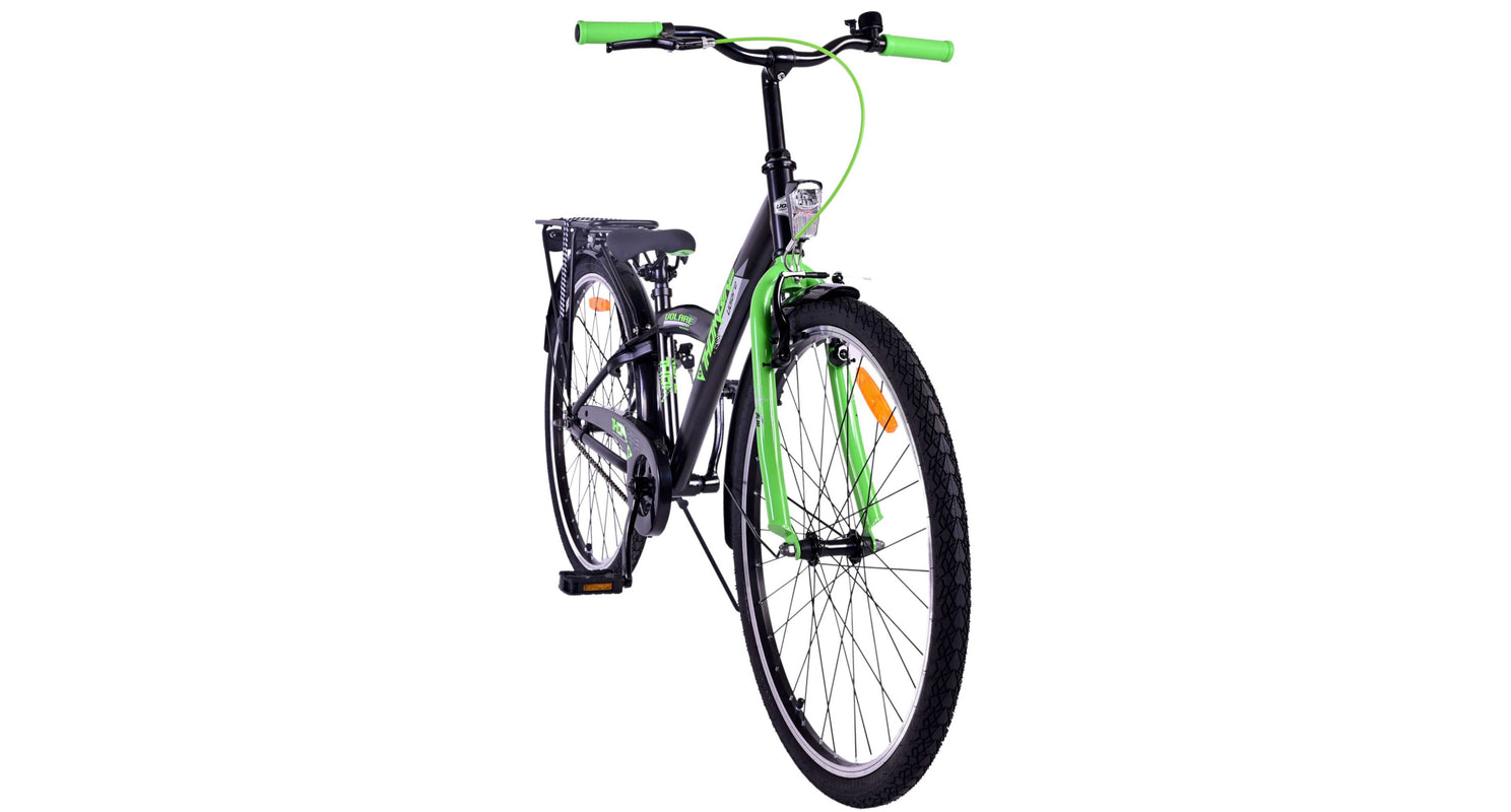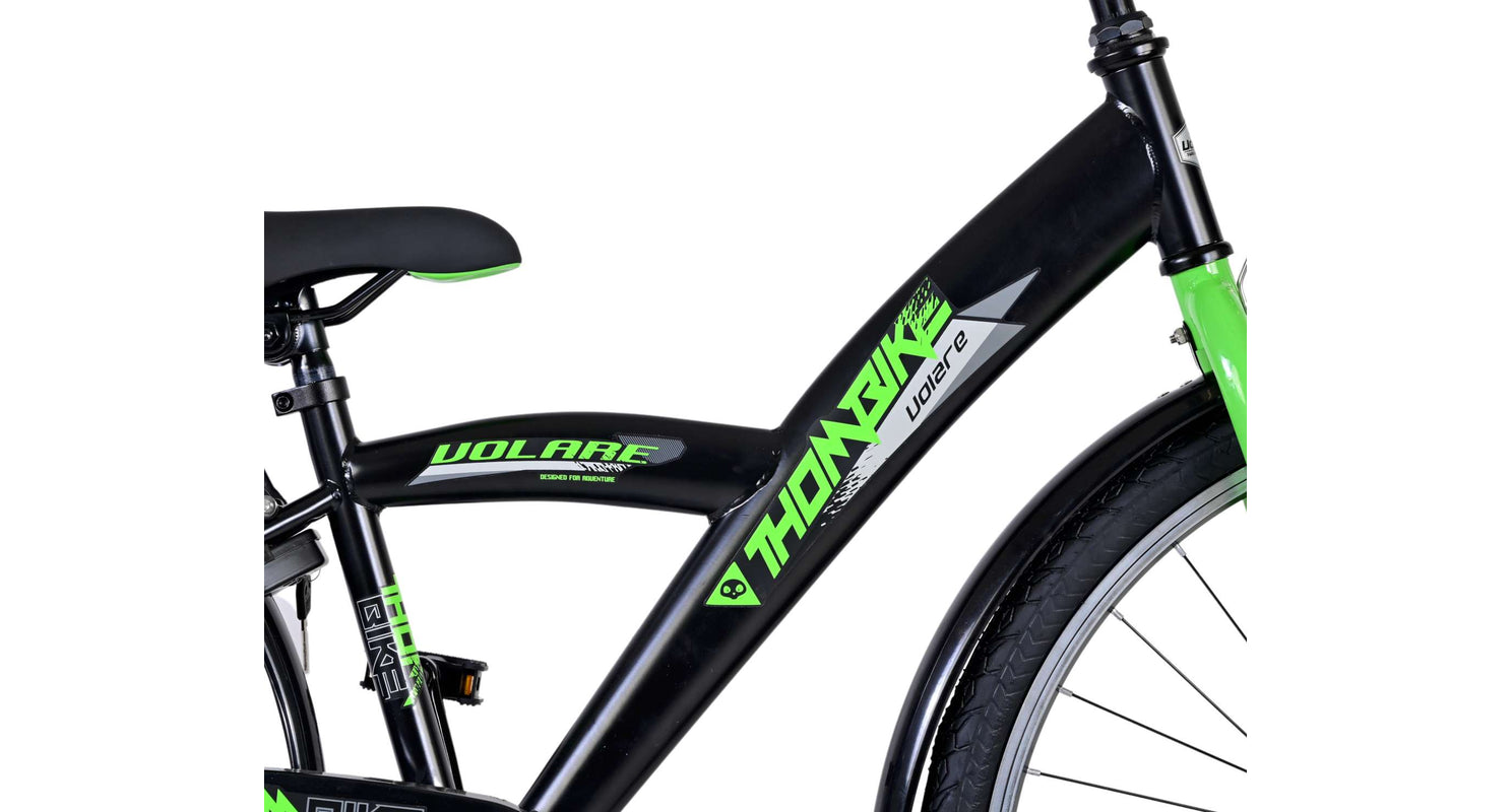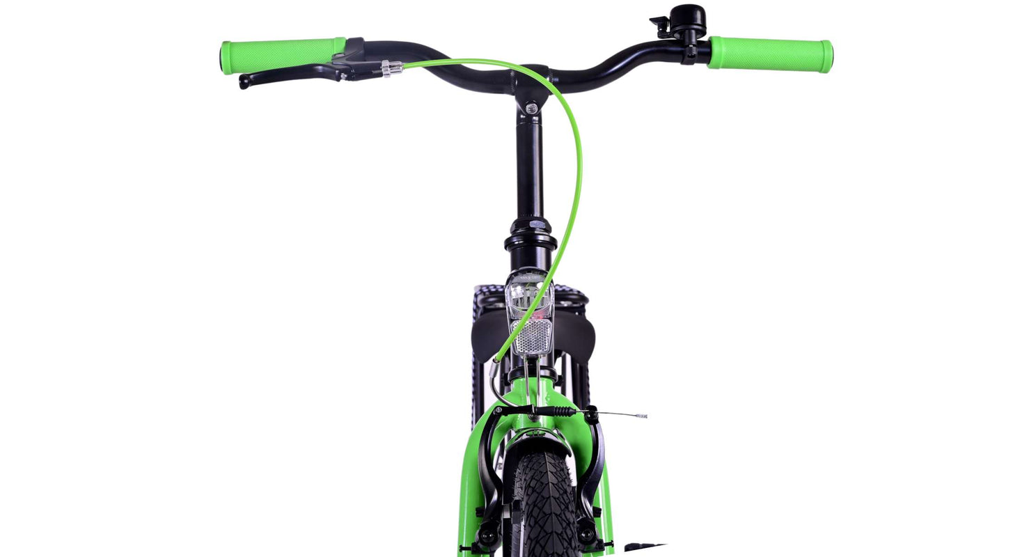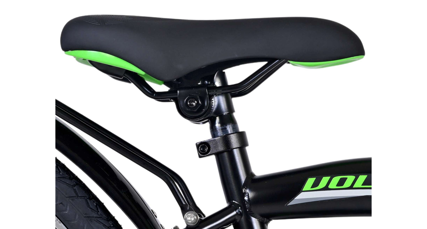 Veiligheid staat voorop! Daarom heeft deze gave fiets een handrem en terugtraprem en verlichting op batterij voor en achter. Daarnaast heeft de fiets een leuke bel en reflectoren in de wielen. Ook aan het comfort is gedacht. De mooie zwarte Volare fiets met groene accenten heeft een luxe zacht zadel en extra zachte handvaten, een handige achterdrager, en een stevig frame dat wel tegen een stootje kan. Verder heeft de fiets een standaard zodat hij netjes blijft staan en een sterk slot. Om zo lang mogelijk van de fiets te kunnen genieten heeft deze een extra lange zadelpen waardoor de fiets nóg langer met het kind meegroeit en ook het stuur is in hoogte verstelbaar.