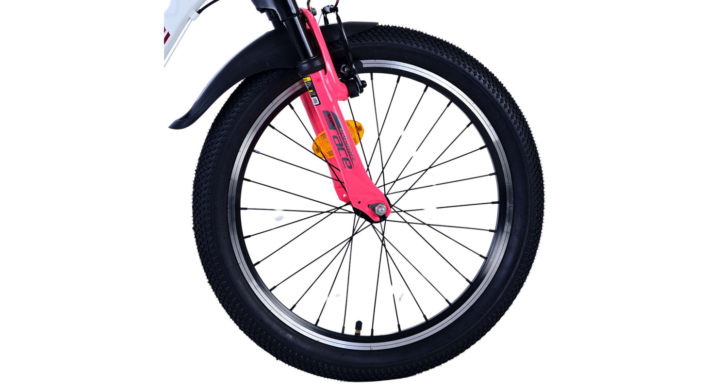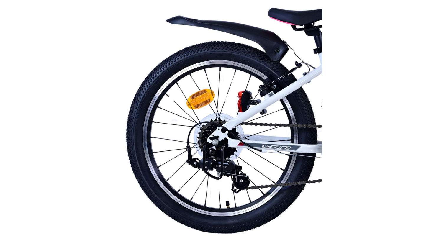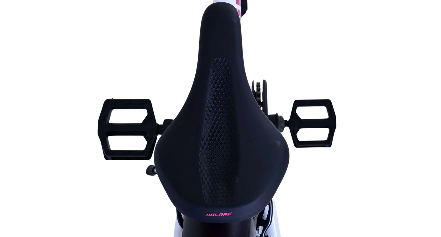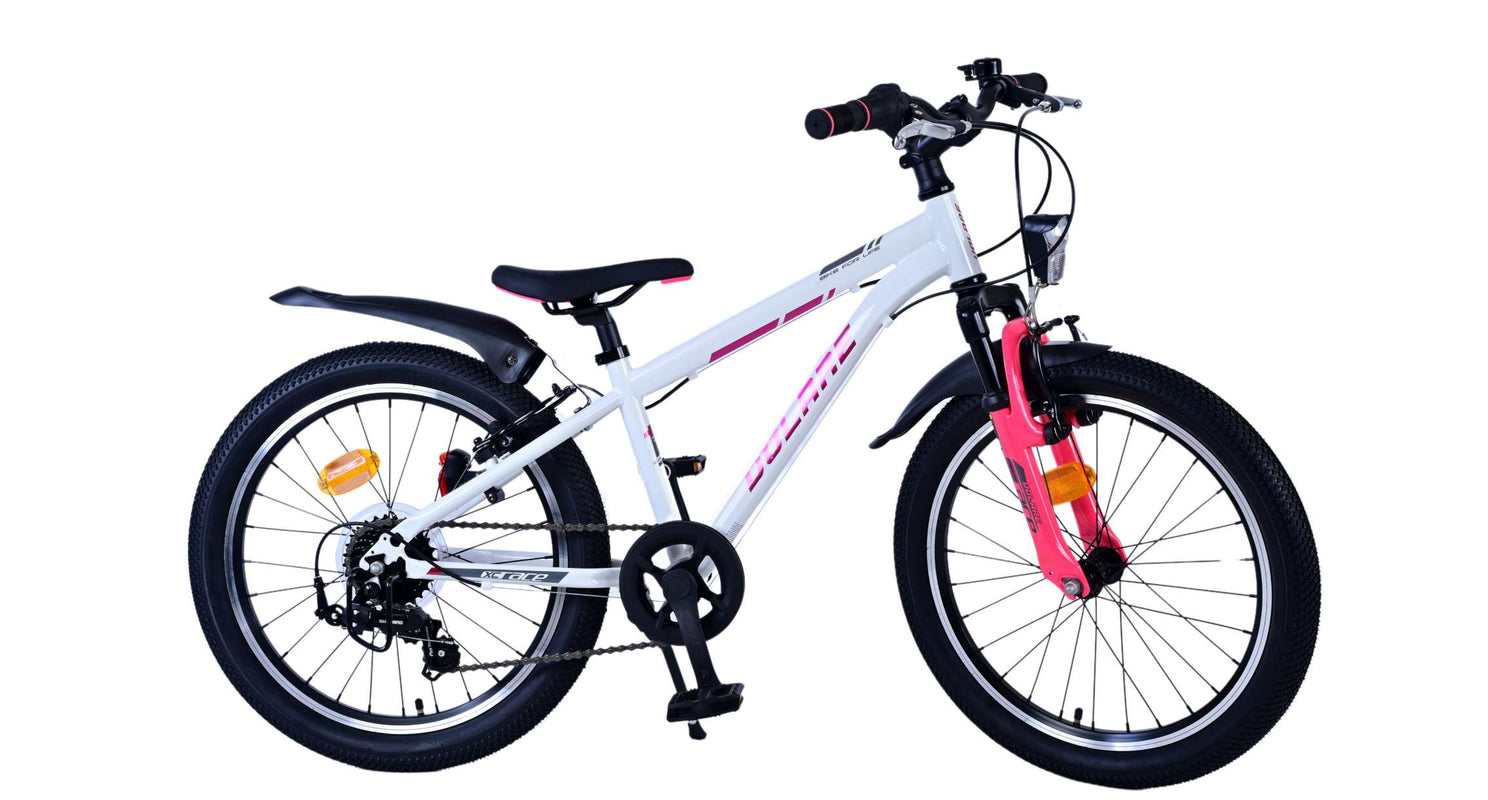 Veiligheid staat voorop! Daarom heeft deze gave fiets 2 handremmen en geen terugtraprem! Daarnaast heeft de fiets 7 versnellingen van shimano met revoshifters, reflectoren in de wielen, reflectoren voor en achter op de fiets, een bel, verlichting voor en achter op verlichting. De gekantelde stuurpen zorgt voor een beter zicht op de weg, maar is daardoor niet in hoogte verstelbaar. Ook aan het comfort is gedacht. De mooie witte Volare fiets met roze accenten heeft een comfortabel zacht zadel, een standaard zodat je fiets netjes blijft staan, en stoere extra brede banden. Om zo lang mogelijk van de fiets te kunnen genieten heeft de fiets een extra lange zadelpen waardoor de fiets nóg langer meegroeit.