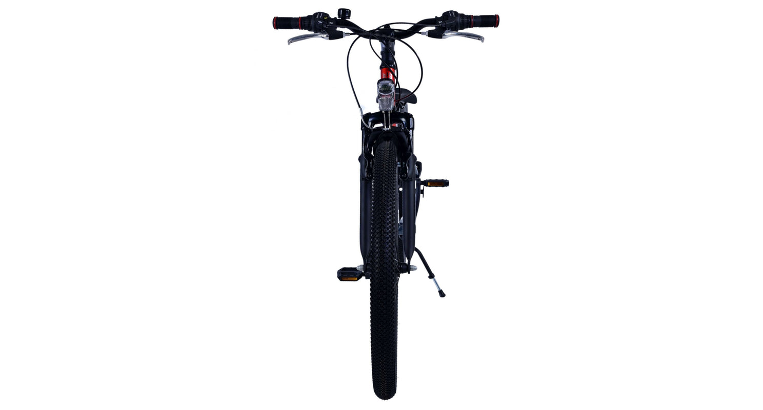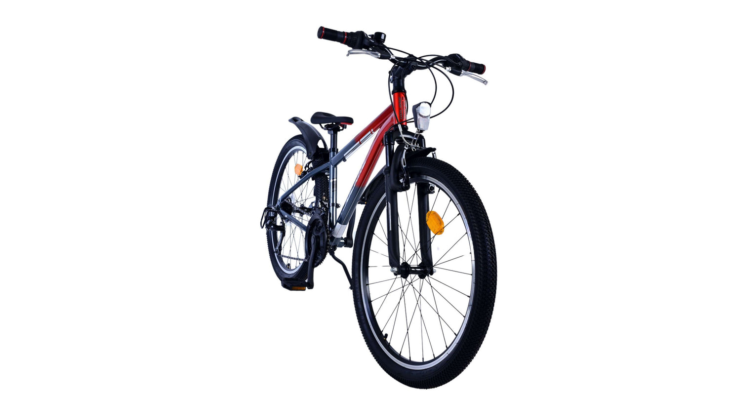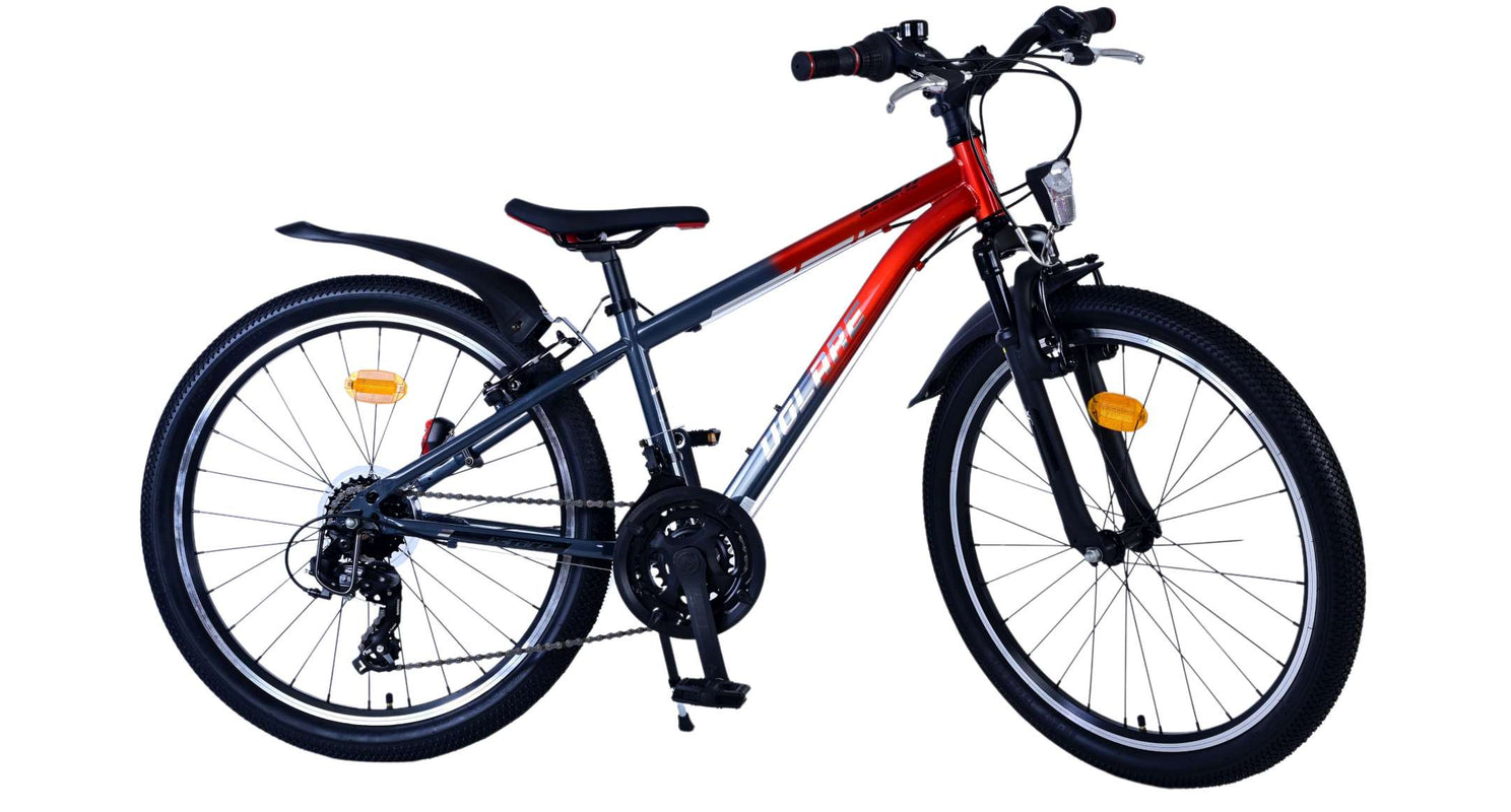 Veiligheid staat voorop! Daarom heeft deze gave fiets 2 handremmen en geen terugtraprem! Daarnaast heeft de fiets 21 versnellingen van shimano met revoshifters, reflectoren in de wielen, reflectoren voor en achter op de fiets, een bel, verlichting op batterijen voor en achter. De gekantelde stuurpen zorgt voor een beter zicht op de weg, maar is daardoor niet in hoogte verstelbaar. Ook aan het comfort is gedacht. De mooie satijn grijze Volare fiets met rode accenten heeft een comfortabel zacht zadel, een standaard zodat je fiets netjes blijft staan, en stoere extra brede banden. Om zo lang mogelijk van de fiets te kunnen genieten heeft de fiets een extra lange zadelpen waardoor de fiets nóg langer meegroeit.