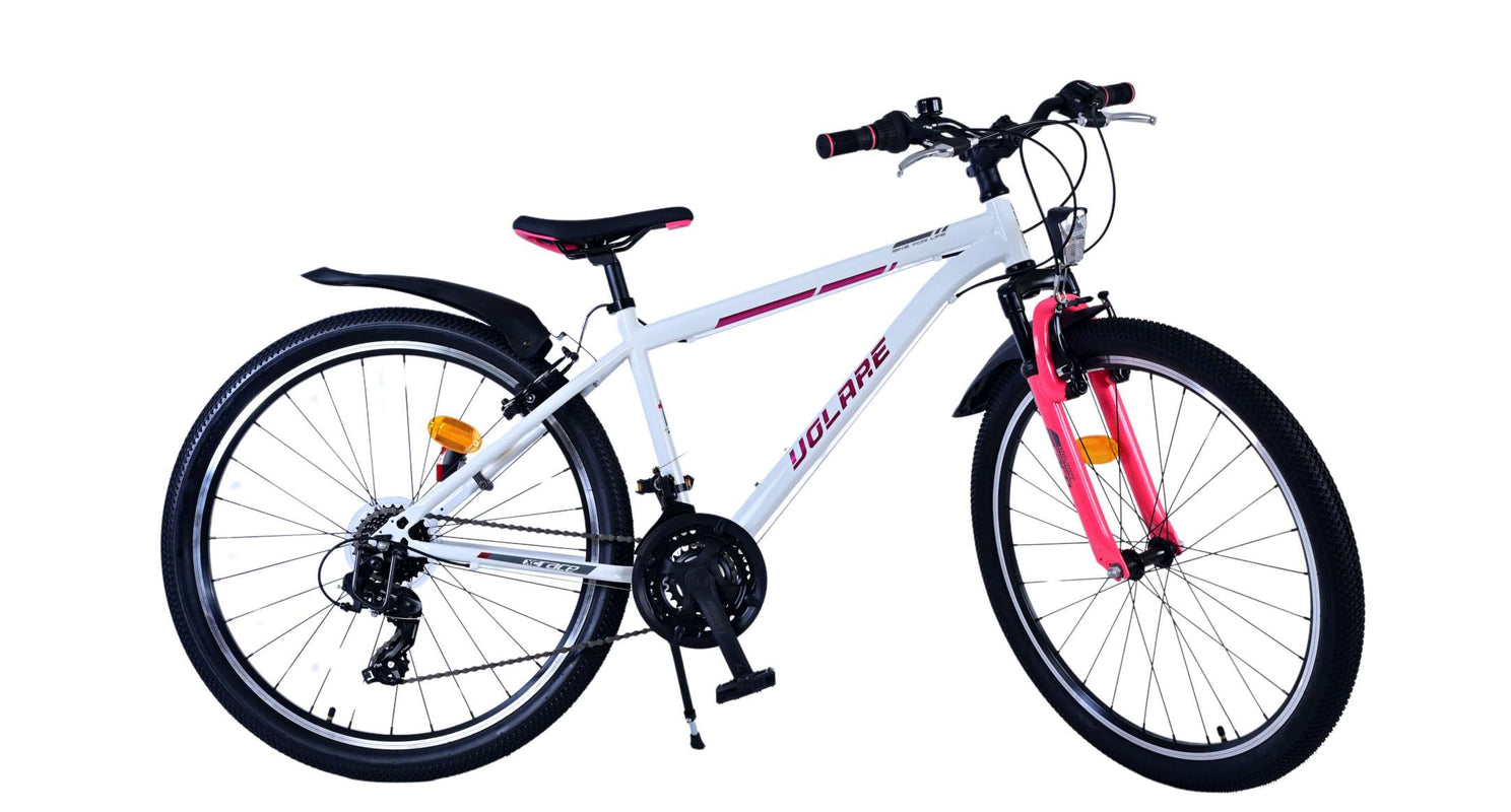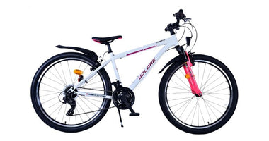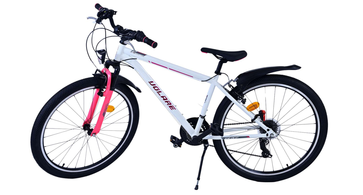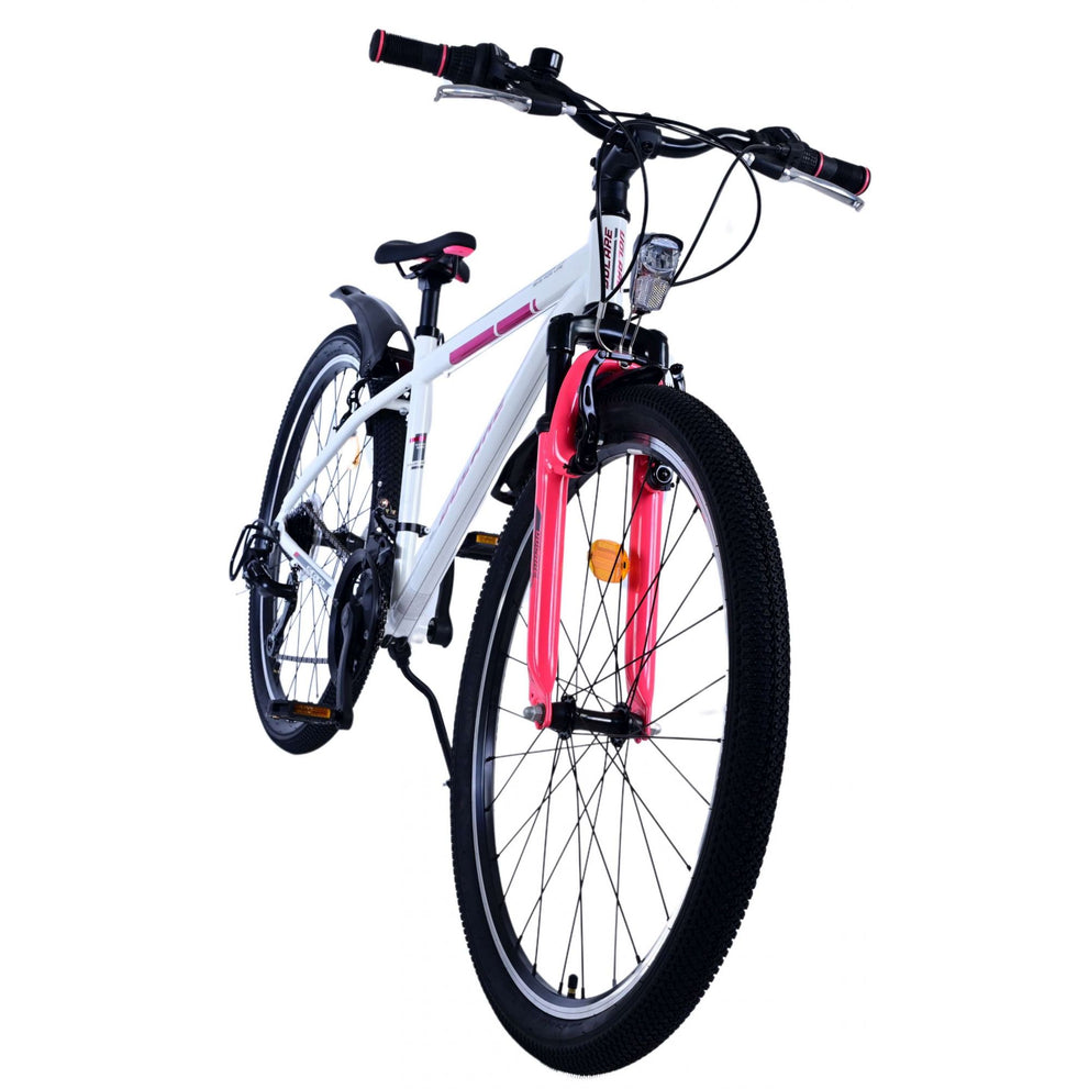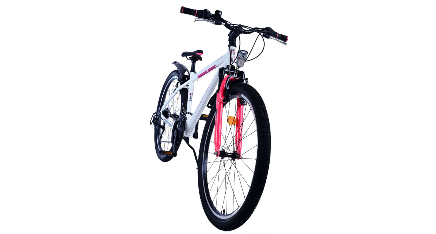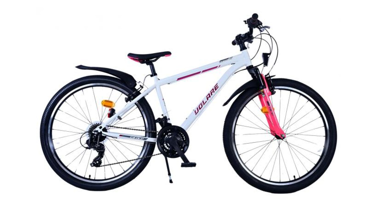 Veiligheid staat voorop! Daarom heeft deze gave fiets 2 handremmen en geen terugtraprem! Daarnaast heeft de fiets 21 versnellingen van shimano met revoshifters, reflectoren in de wielen, reflectoren voor en achter op de fiets, een bel, verlichting op batterijen voor en achter. De gekantelde stuurpen zorgt voor een beter zicht op de weg, maar is daardoor niet in hoogte verstelbaar. Ook aan het comfort is gedacht. De mooie witte Volare fiets met roze accenten heeft een comfortabel zacht zadel, een standaard zodat je fiets netjes blijft staan, en stoere extra brede banden. Om zo lang mogelijk van de fiets te kunnen genieten heeft de fiets een extra lange zadelpen waardoor de fiets nóg langer meegroeit.