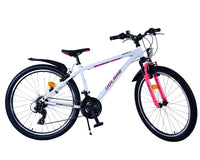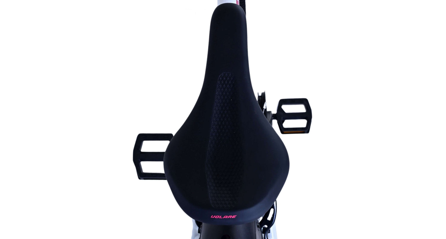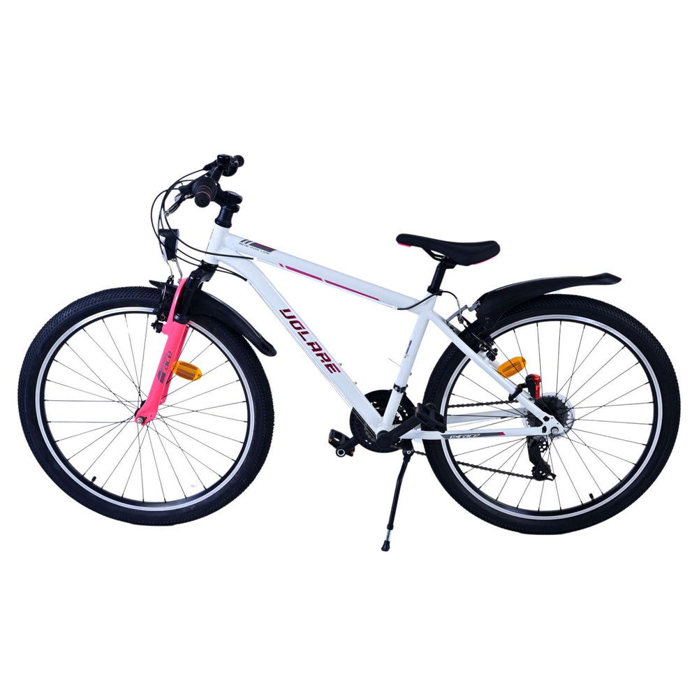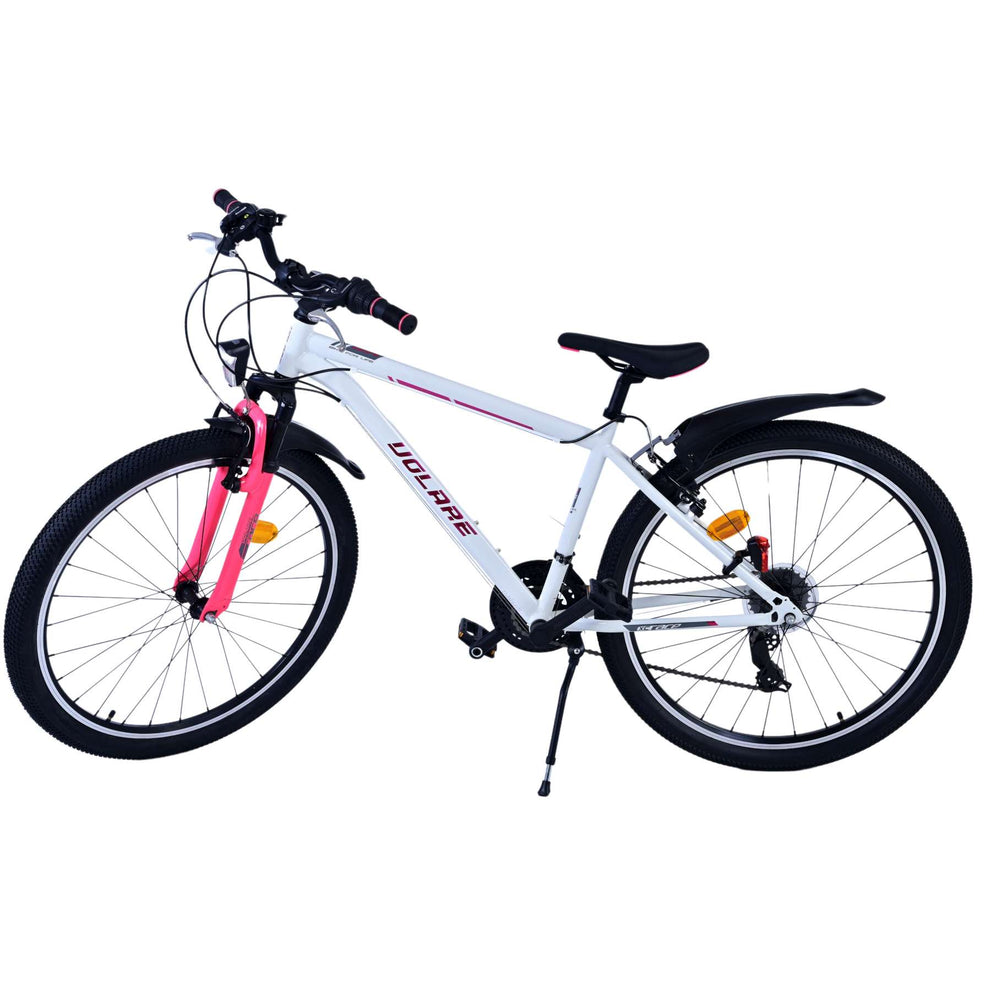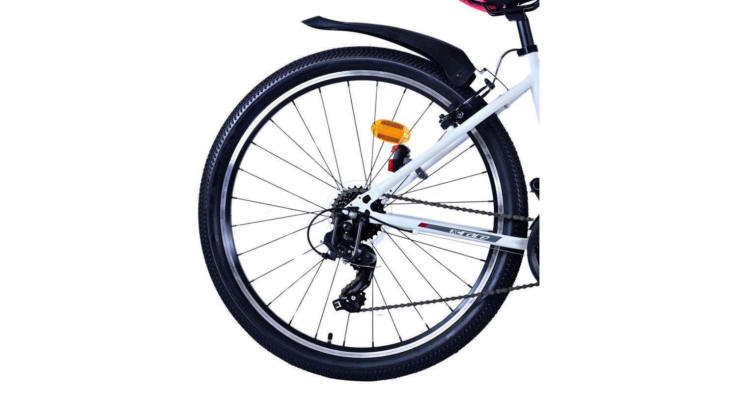 Veiligheid staat voorop! Daarom heeft deze gave fiets 2 handremmen en geen terugtraprem! Daarnaast heeft de fiets 21 versnellingen van shimano met revoshifters, reflectoren in de wielen, reflectoren voor en achter op de fiets, een bel, verlichting op batterijen voor en achter. De gekantelde stuurpen zorgt voor een beter zicht op de weg, maar is daardoor niet in hoogte verstelbaar. Ook aan het comfort is gedacht. De mooie witte Volare fiets met roze accenten heeft een comfortabel zacht zadel, een standaard zodat je fiets netjes blijft staan, en stoere extra brede banden. Om zo lang mogelijk van de fiets te kunnen genieten heeft de fiets een extra lange zadelpen waardoor de fiets nóg langer meegroeit.