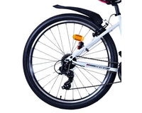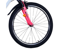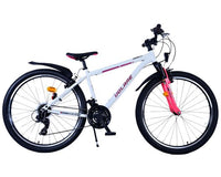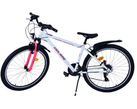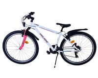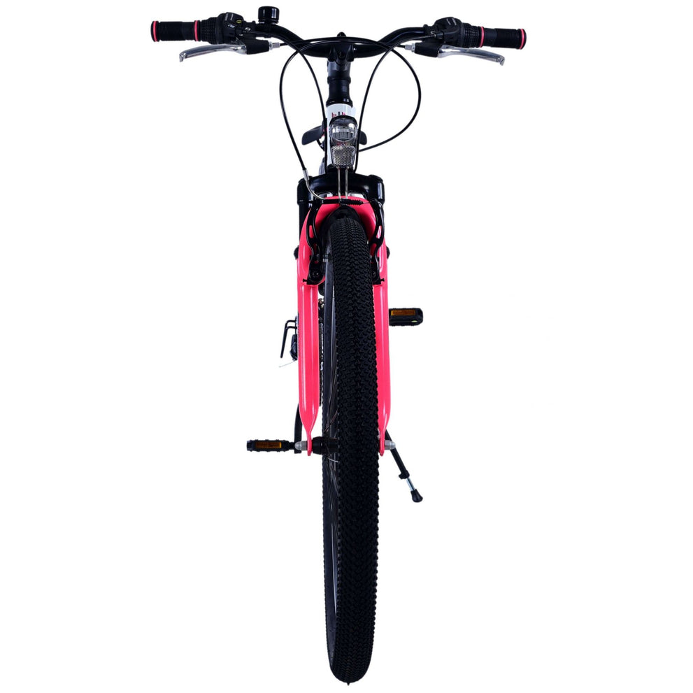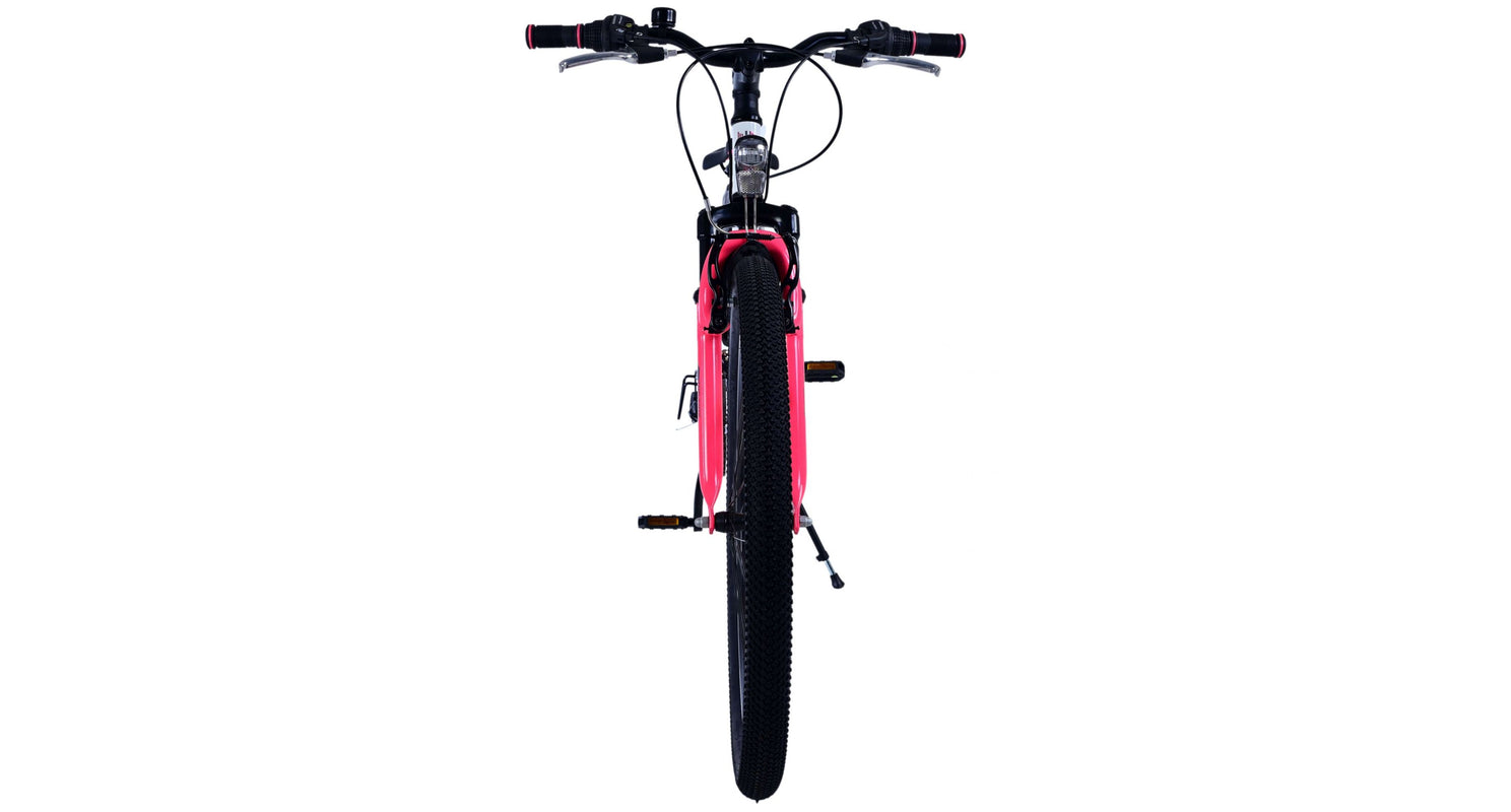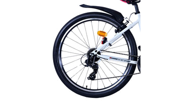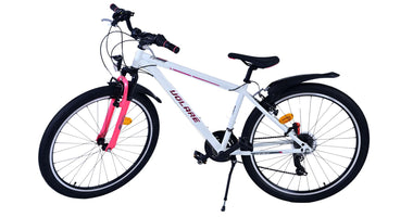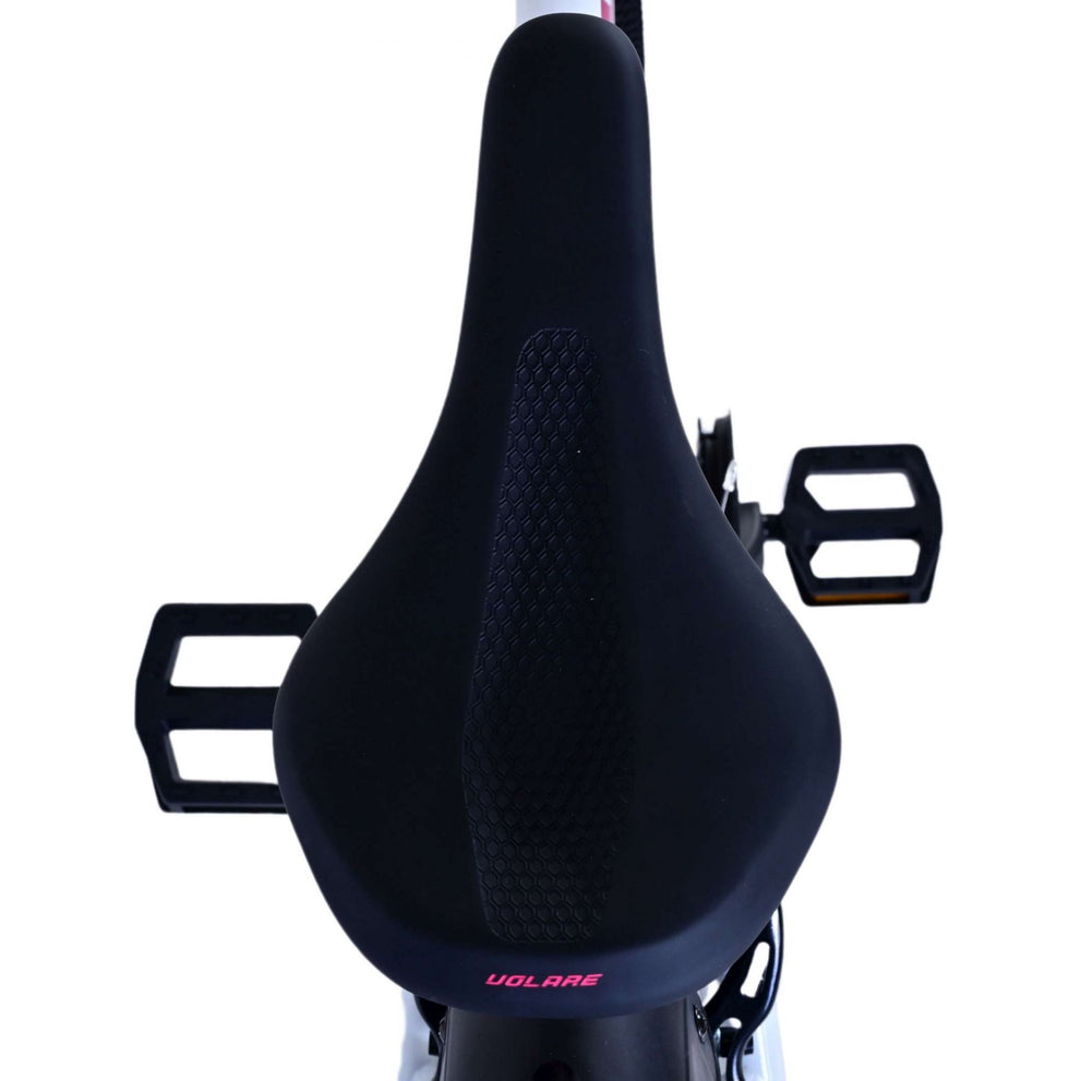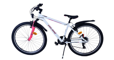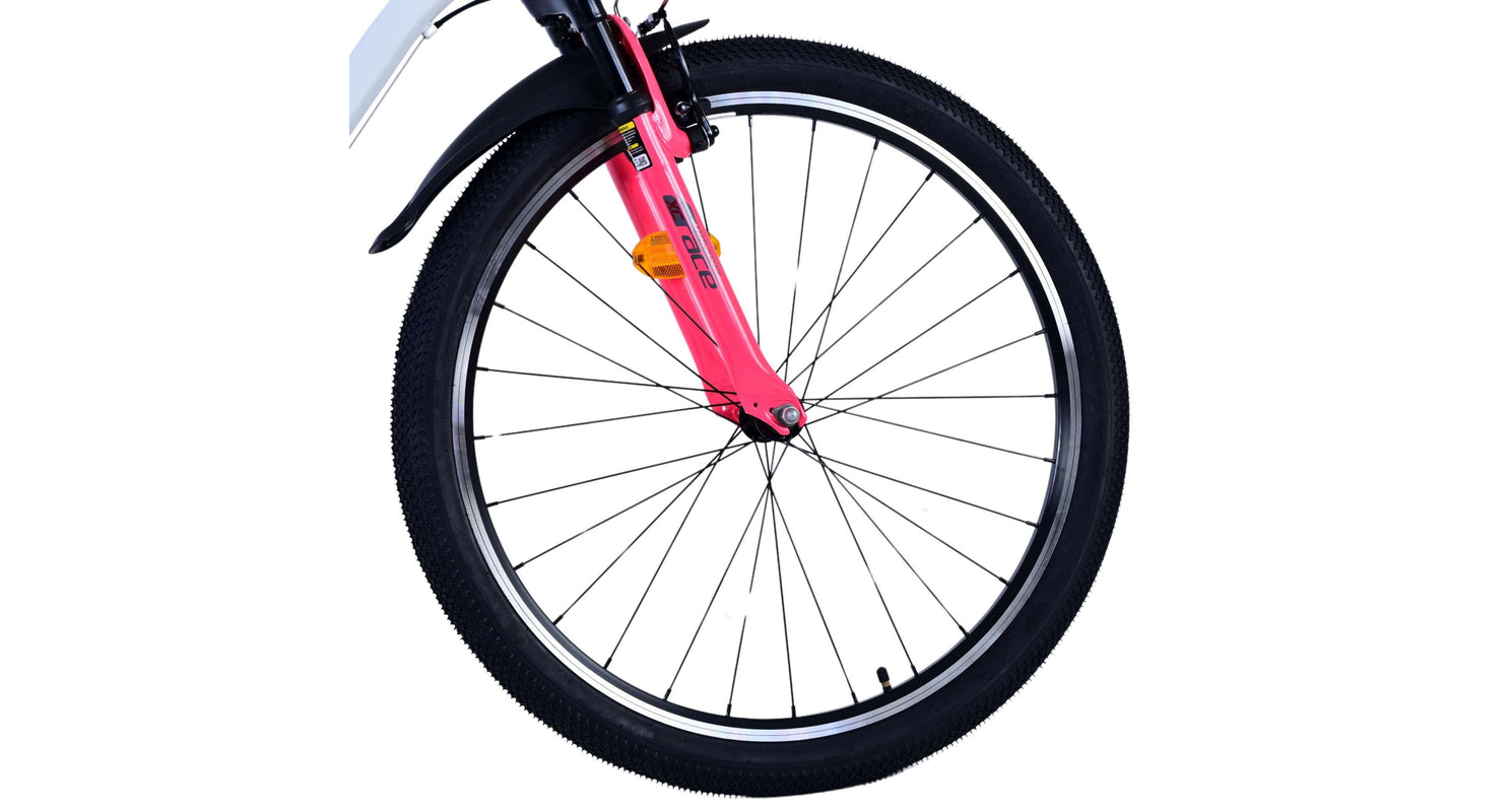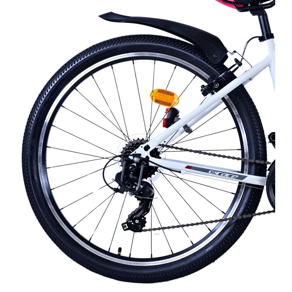 Veiligheid staat voorop! Daarom heeft deze gave fiets 2 handremmen en geen terugtraprem! Daarnaast heeft de fiets 21 versnellingen van shimano met revoshifters, reflectoren in de wielen, reflectoren voor en achter op de fiets, een bel, verlichting op batterijen voor en achter. De gekantelde stuurpen zorgt voor een beter zicht op de weg, maar is daardoor niet in hoogte verstelbaar. Ook aan het comfort is gedacht. De mooie witte Volare fiets met roze accenten heeft een comfortabel zacht zadel, een standaard zodat je fiets netjes blijft staan, en stoere extra brede banden. Om zo lang mogelijk van de fiets te kunnen genieten heeft de fiets een extra lange zadelpen waardoor de fiets nóg langer meegroeit.